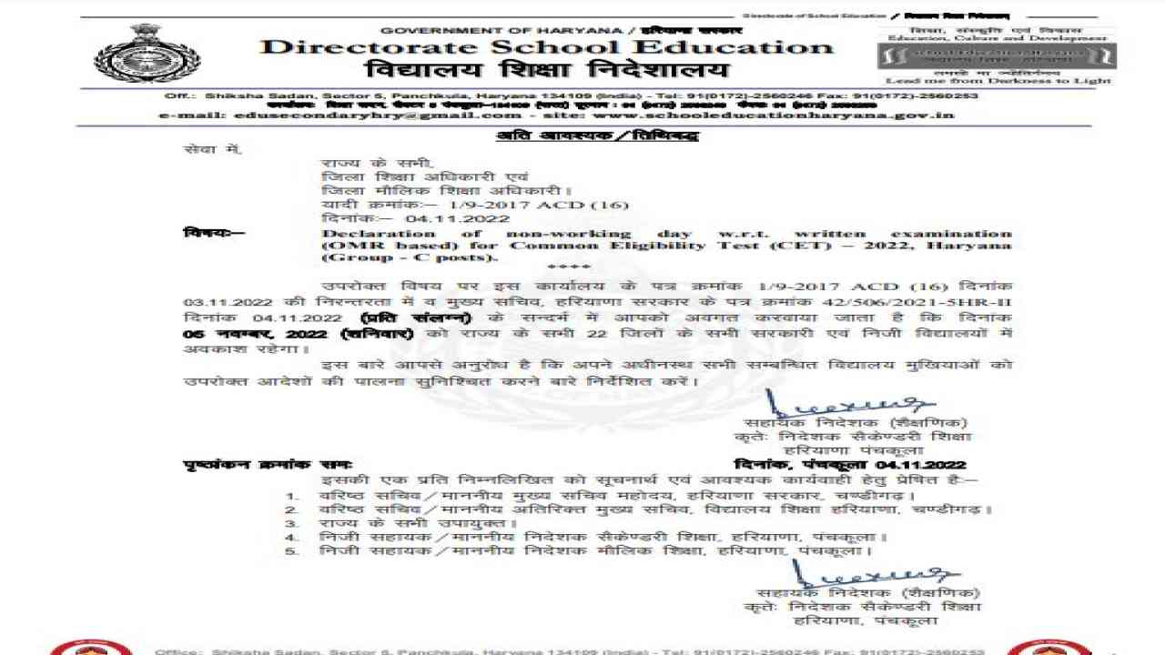 पंचकूला: हरियाणा में कल सभी सरकारी और निजी स्कूलों में अवकाश रहेगा। इस संबंध हरियाणा शिक्षा निदेशालय पंचकूला ने निर्देश जारी कर दिए हैं। सीईटी एग्जाम के चलते स्कूलों में ये छुट्टी घोषित की गई है।
