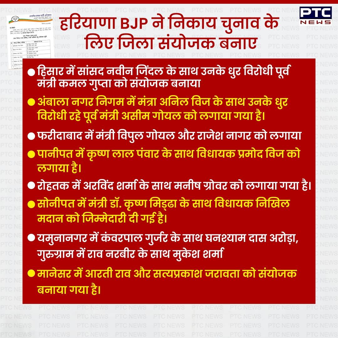 बात करें रोहतक की तो यहां अरविंद शर्मा के साथ मनीष ग्रोवर को लगाया गया है। सोनीपत में विधानसभा के उपाध्यक्ष डॉ. कृष्ण मिड्ढा के साथ विधायक निखिल मदान को जिम्मेदारी दी गई है। यमुनानगर में पूर्व मंत्री कंवरपाल गुर्जर के साथ घनश्याम दास अरोड़ा को संयोजक बनाया है। इसके अलावा कैप्टन योगेश बैरागी को जुलाना नगर परिषद की जिम्मेदारी दी गई है।