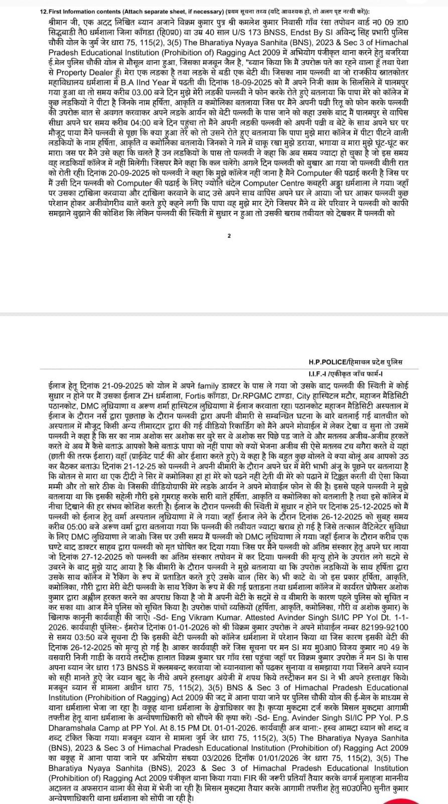 धर्मशाला कॉलेज छात्रा मौत मामले में आरोपी प्रोफेसर सहित तीन छात्राओं के खिलाफ दर्ज हुई FIR, पीड़िता बोली- सर अजीब-अजीब हरकतें करते थे !