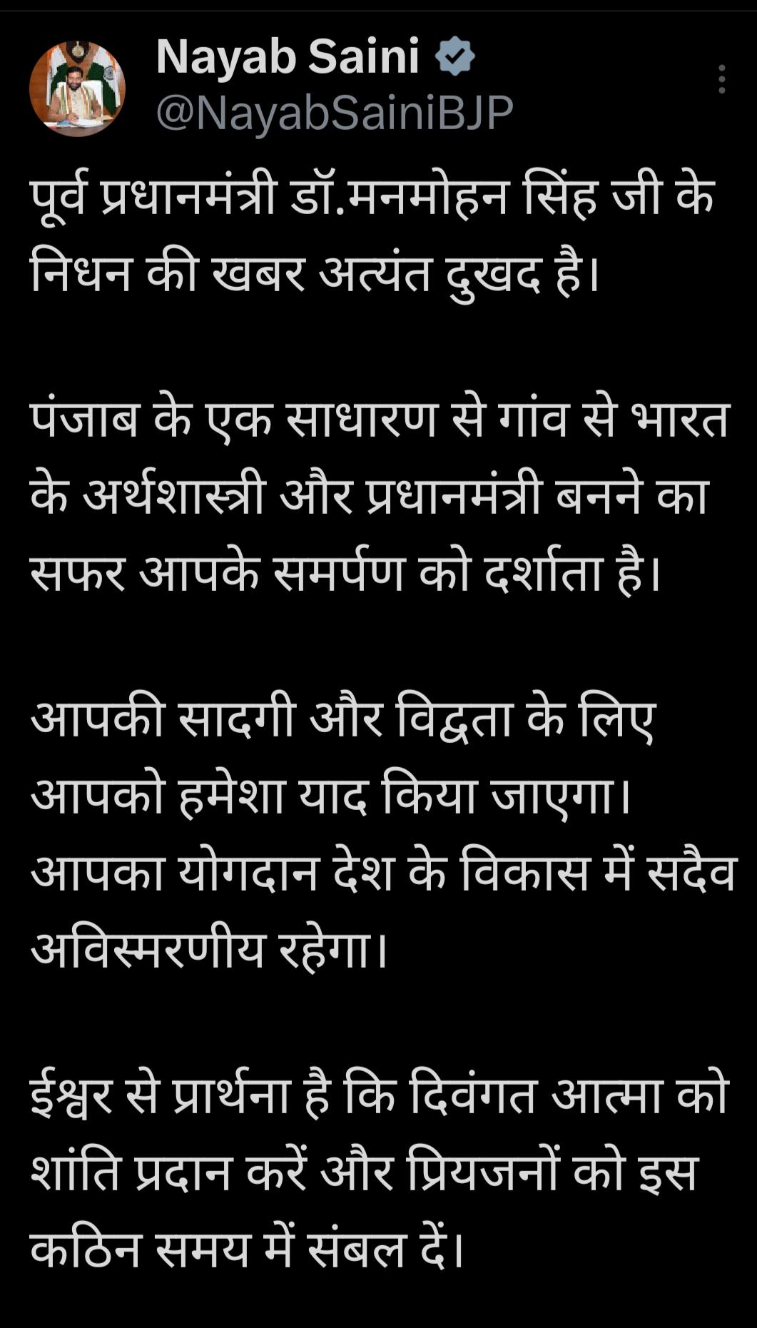 पूर्व प्रधानमंत्री डॉ मनमोहन सिंह के निधन पर सीएम नायब सैनी ने जताया शोक, X पर लिखा भावुक पोस्ट