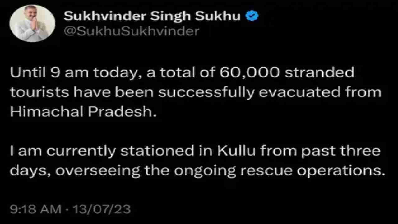 हिमाचल के मुख्यमंत्री सुखविंदर सुक्खू ने ट्वीट कर जानकारी दी कि आज सुबह 9 बजे तक हिमाचल प्रदेश से कुल 60,000 फंसे हुए पर्यटकों को सफलतापूर्वक निकाला जा चुका है. उन्होंने लिखा कि मैं पिछले तीन दिनों से कुल्लू में हूं और बचाव कार्यों की देखरेख कर रहा हूं.