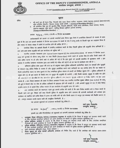 किसानों के साथ लगातार पुलिस की बैठकों का दौर जारी है. इस बीच आपको बता दें कि किसान नेता जगजीत सिंह डल्लेवाल के आमरण अनशन का आज 10वां दिन है. उनकी सेहत भी नासाज़ बताई जा रही है, डल्लेवाली की पत्नी का कहना है कि वो कैंसर की अपनी दवा भी नहीं ले रहे हैं जिससे उनकी तबीयत बिगड़ने की भी आशंका है. किसानों नेताओं का साफ कहना है कि सरकार द्वारा मांगें माने जाने तक उनका अनशन यूं ही चलता रहेगा. इस बीच अम्बाला पुलिस की ओर से किसानों को जो नोटिस हुआ है उसे देखें-