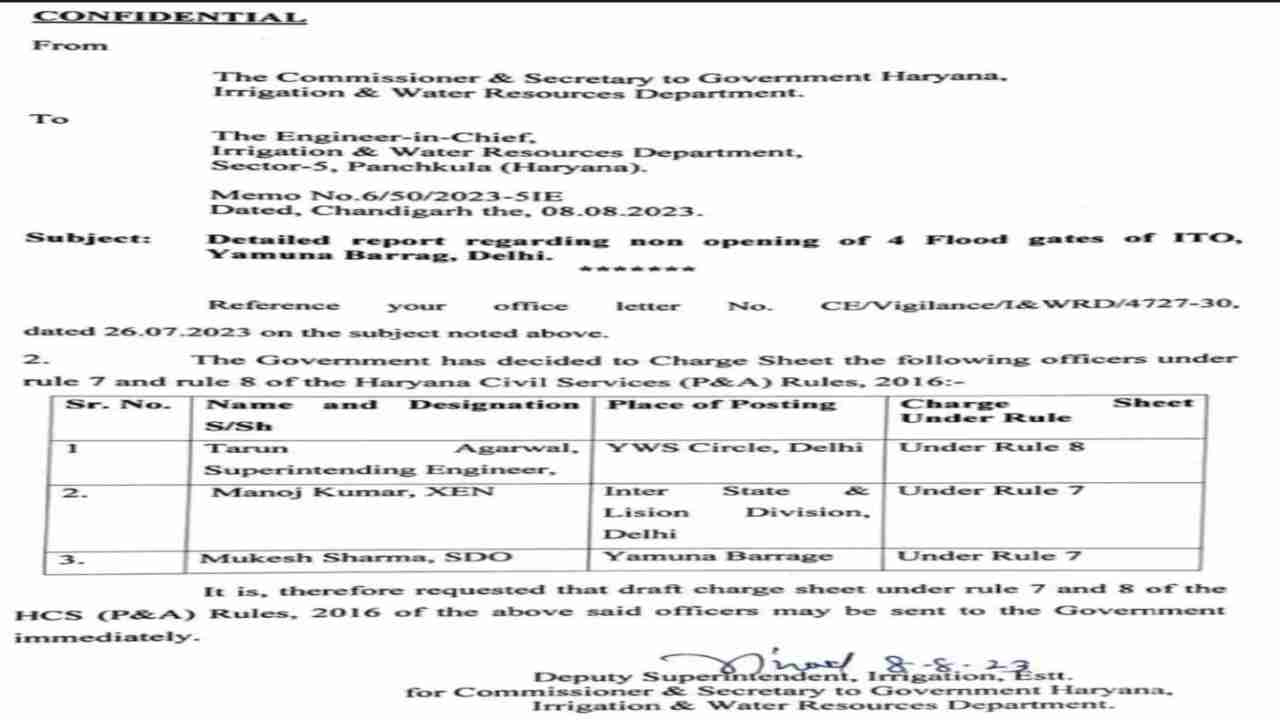 दरअसल, दिल्ली में ITO यमुना बैराज के बाढ़ के दौरान 4 गेट नहीं खोले जाने पर सीएम मनोहर लाल ने चीफ इंजीनियर संदीप तनेजा को सस्पेंड कर दिया है. साथ ही SE तरुण अग्रवाल और XEN मनोज कुमार, यमुना बैराज पर तैनात SDO मुकेश वर्मा को चार्जशीट करने के आदेश जारी किए हैं.