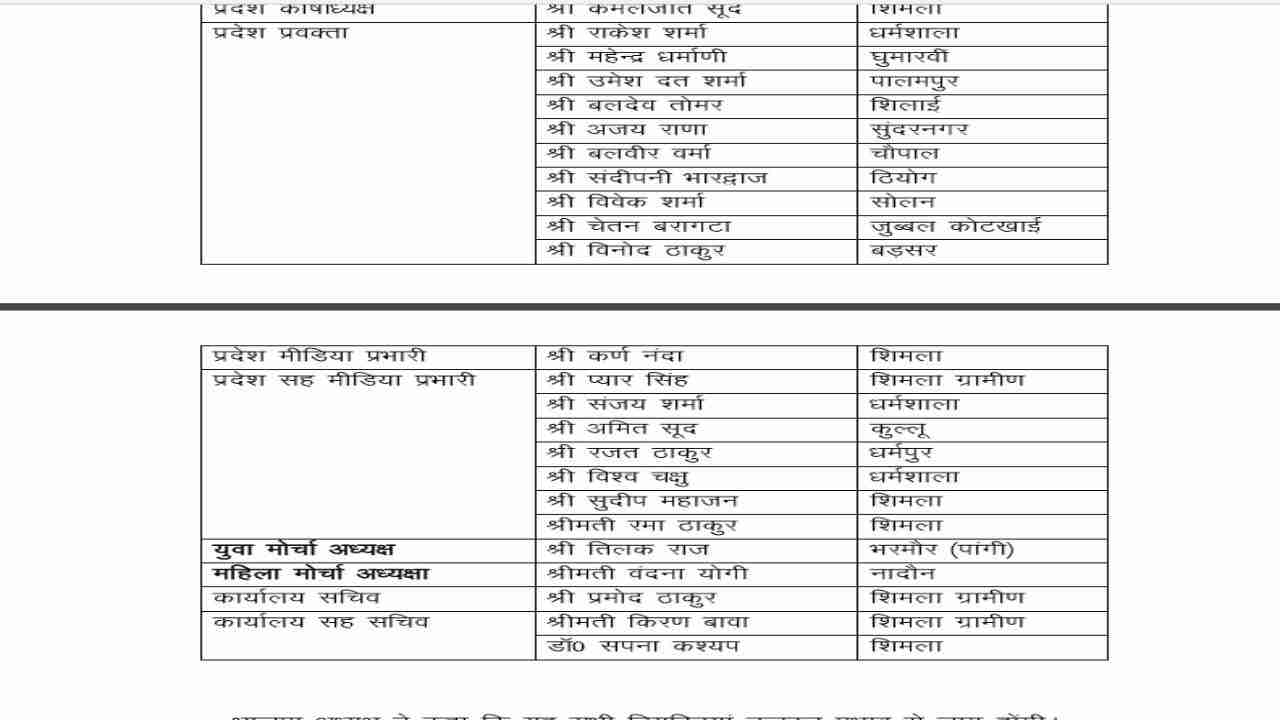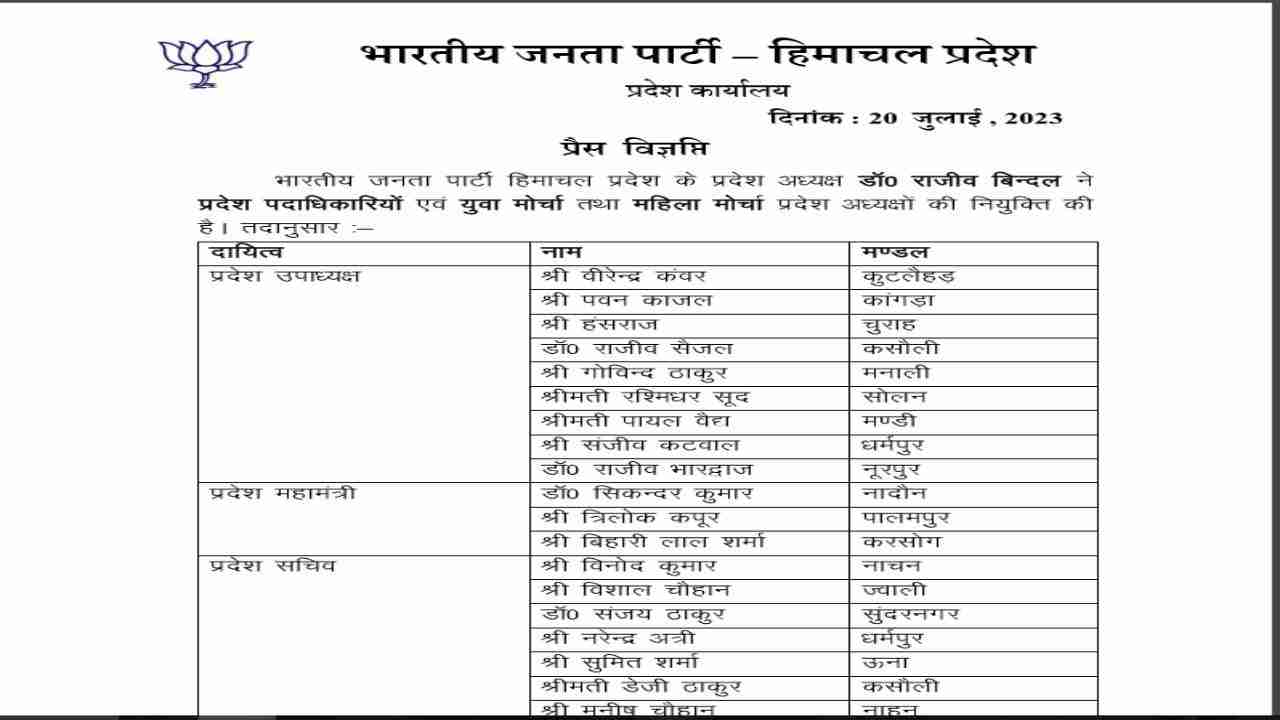 लोकसभा चुनाव के लिए डॉ राजीव बिंदल की नई टीम तैयार, BJP ने जारी की प्रदेश पदाधिकारीयों की सूची