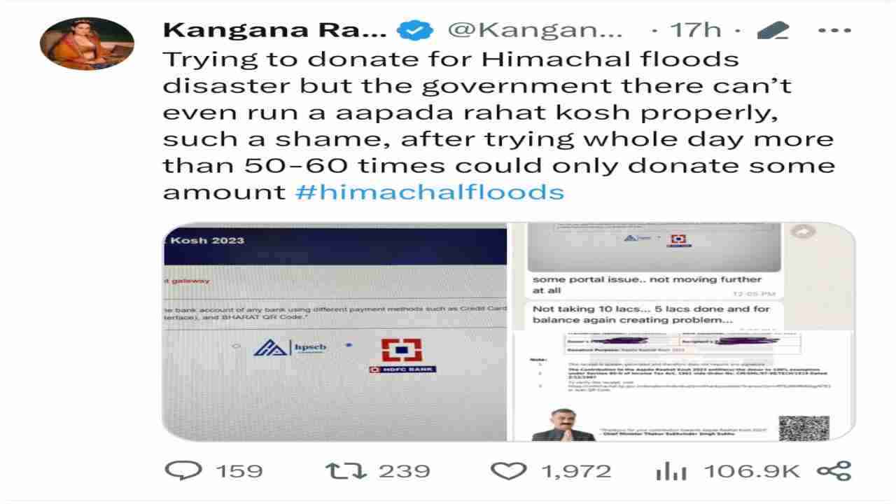 जिला मंडी से तालुक रखने वाली अभिनेत्री कंगना रनौत ने ट्विटर कर हिमाचल प्रदेश मुख्यमंत्री आपदा राहत कोष का सही ढंग से संचालन न पर सवाल उठाए हैं।