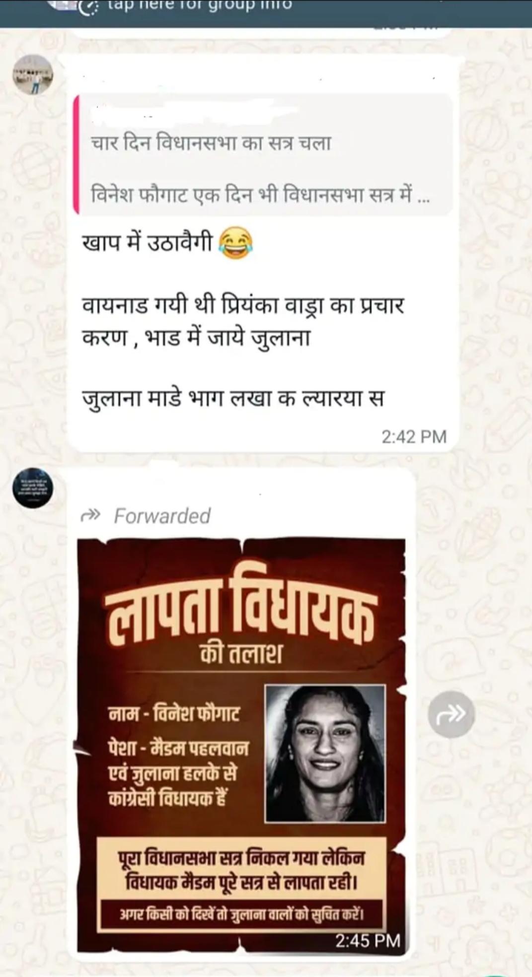 जींद: विधानसभा जुलाना से विधायक बनीं अंतरराष्ट्रीय पहलवान विनेश फोगाट का एक पोस्टर वायरल हो रहा है। पोस्टर तमाम व्हाट्सएप ग्रुपों में वायरल है। पोस्टर में लिखा है कि लापता विधायक की तलाश है किसी को पता हो तो सूचना दें।