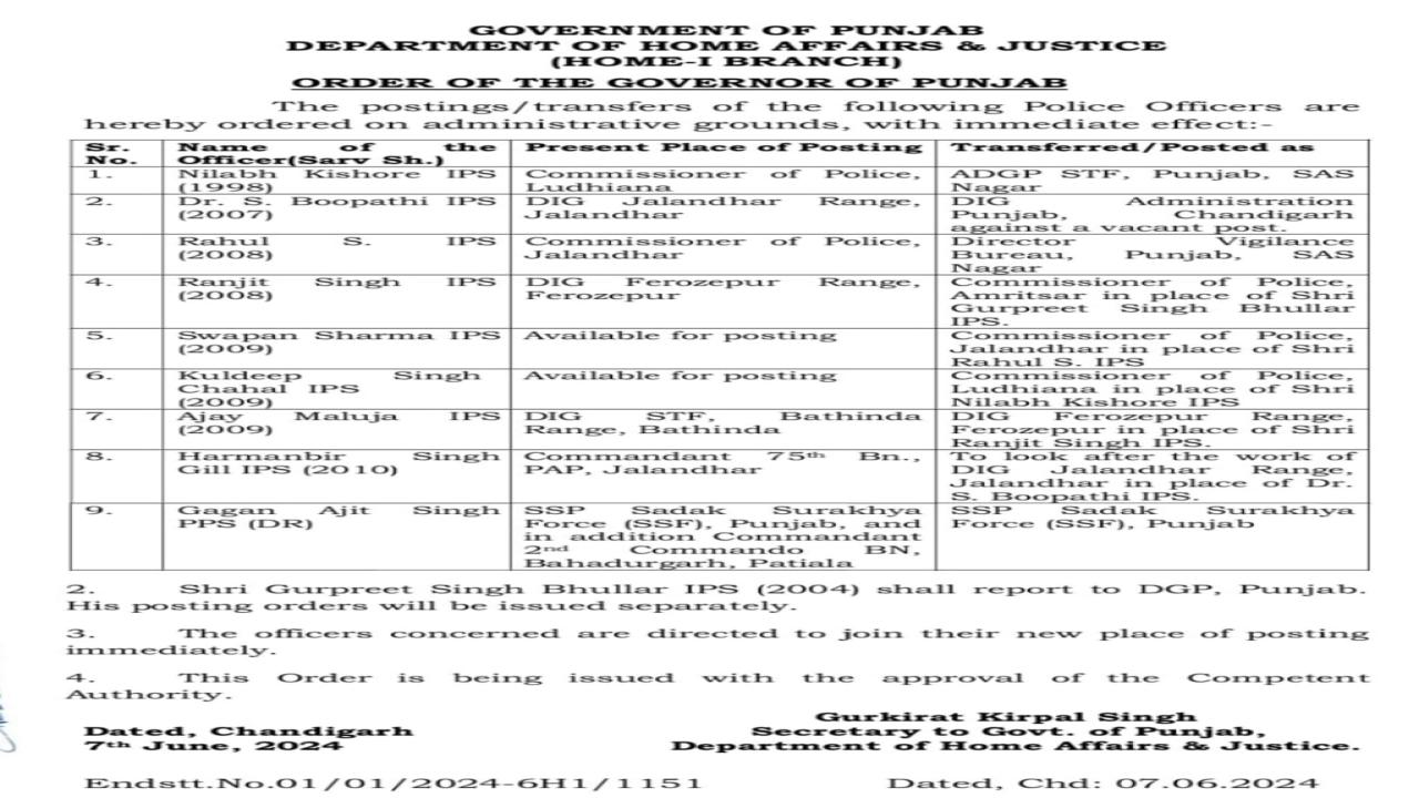 Punjab News: ਲੋਕ ਸਭਾ ਚੋਣਾਂ ਮੁਕੰਮਲ ਹੁੰਦੇ ਸਾਰ ਪੰਜਾਬ ਵਿੱਚ ਵੱਡਾ ਪ੍ਰਸ਼ਾਸਨਿਕ ਫੇਰਬਦਲ ਹੋਇਆ ਹੈ। ਪੰਜਾਬ ਸਰਕਾਰ ਵੱਲੋਂ ਜਲੰਧਰ ਅਤੇ ਲੁਧਿਆਣਾ ਦੇ ਪੁਲਸ ਕਮਿਸ਼ਨਰਾਂ ਸਮੇਤ ਕੁੱਲ 9 ਅਫ਼ਸਰਾਂ ਦੇ ਤਬਾਦਲੇ ਕੀਤੇ ਗਏ ਹਨ।
