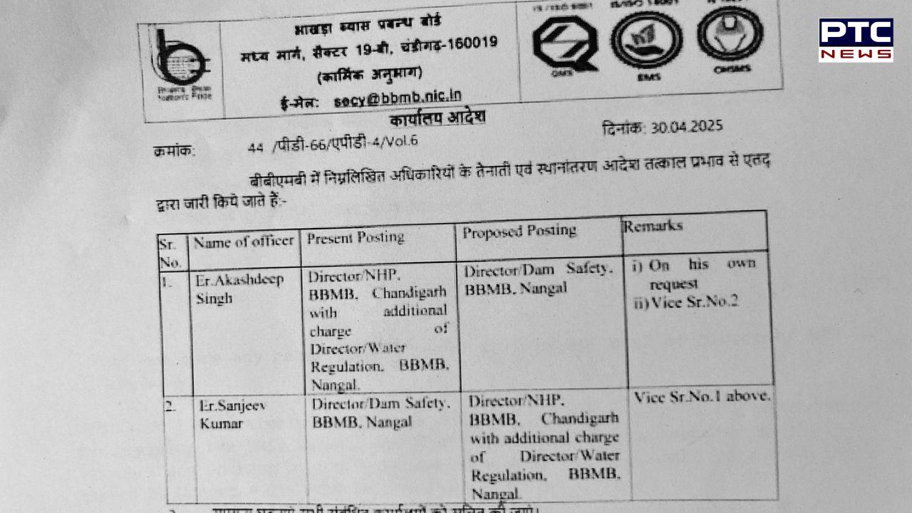 Two senior officials of Bhakhra Beas Management Board (BBMB) have been transferred following the water regulation body's directives for Punjab to release 8,500 cusecs of water to Haryana. Akashdeep Singh who was posted as Director of water regulation body will now assume the post of Director Safety, BBMB Nangal. Meanwhile another officer Sanjeev Kumar will now oversee as the Director of water regulation body.