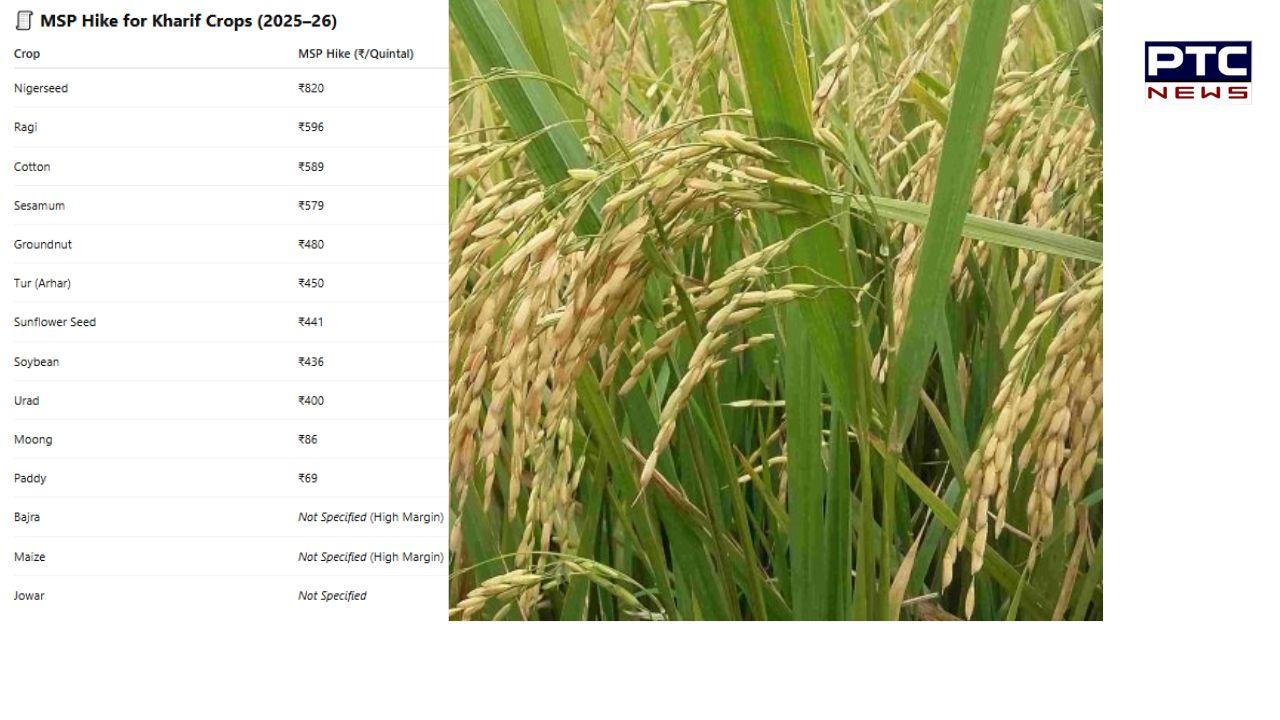PTC Web Desk: The Union Cabinet has approved a hike in the Minimum Support Price (MSP) for 14 major Kharif crops for the 2025-26 marketing season, a move aimed at ensuring fair remuneration for farmers ahead of the sowing period. Among the crops, nigerseed saw the highest absolute increase in MSP at Rs 820 per quintal, followed by ragi with Rs 596, cotton with Rs 589, and sesamum at Rs 579 per quintal. The MSP for paddy, India’s most widely grown Kharif crop, has been increased by Rs 69 per quintal.