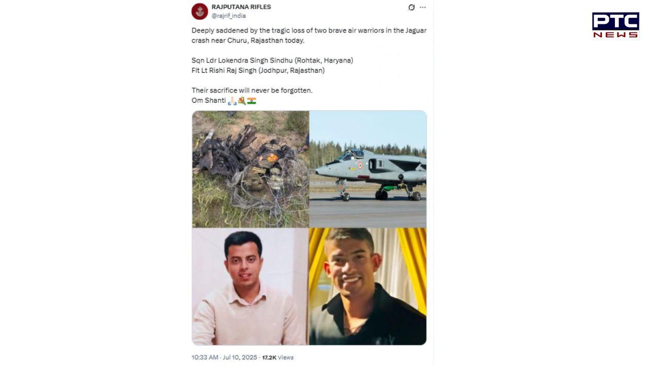 The Rajputana Rifles, among many military units and veterans, also paid tribute. "Deeply saddened by the tragic loss of two brave air warriors... Their sacrifice will never be forgotten," the unit posted on X (formerly Twitter).