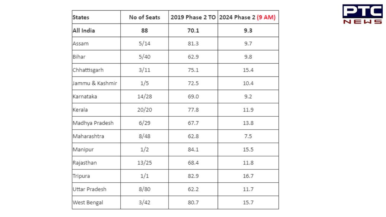 Kerala, where polling is underway for all 20 Lok Sabha seats in the second phase of the general elections on Friday, recorded a voter turnout of 11.98 per cent till 9 am, according to data shared by the Election Commission (EC)