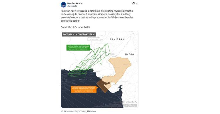 According to reports, Pakistan has not given any official reason for issuing the Notice to Airmen (Notam) for October 28 and 29. However, defence analysts believe it could be linked to either a military drill or a planned weapons test. The timing of Pakistan’s move has raised eyebrows, as it follows India’s own Notam issued for Exercise Trishul, a major joint operation involving the Army, Navy, and Air Force, from October 30 to November 10 near the Sir Creek region.