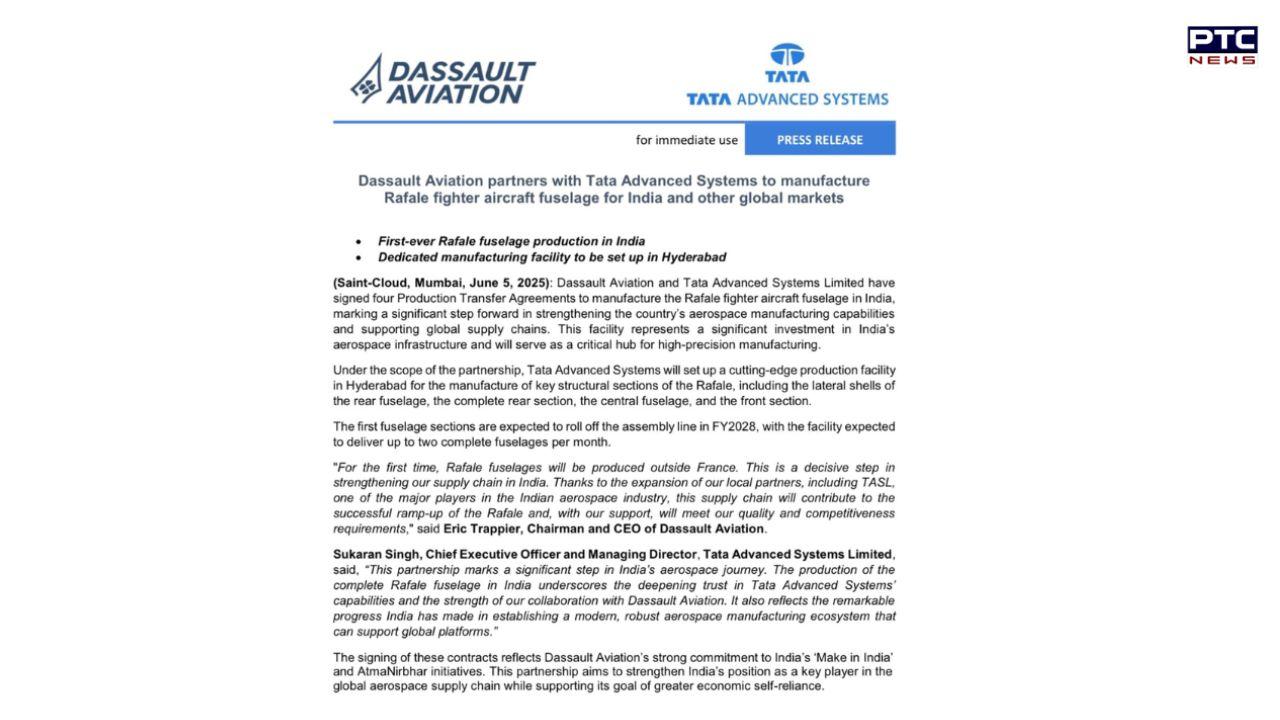 PTC Web Desk: In a major development for India's defence manufacturing sector, Tata Advanced Systems Limited (TASL) has signed four production transfer agreements with France’s Dassault Aviation to locally manufacture the main fuselage of Rafale fighter jets in Hyderabad. This marks the first time ever that the central structure of the Rafale—a critical component of the aircraft—will be built outside France.