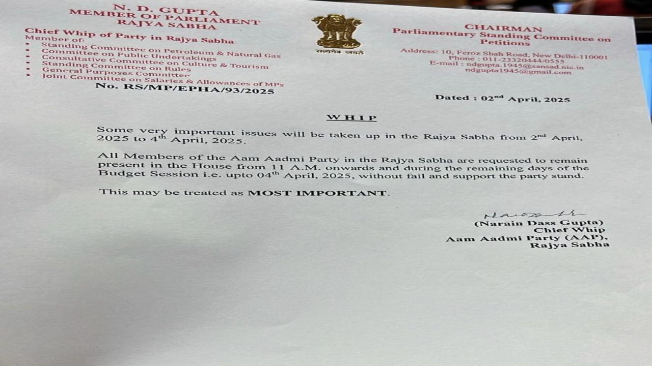 The Aam Aadmi Party has issued a three-line whip to its Rajya Sabha MPs to remain present in parliament from April 2-4, 2025 amid showdown over Waqf (Amendment) Bill 2024.