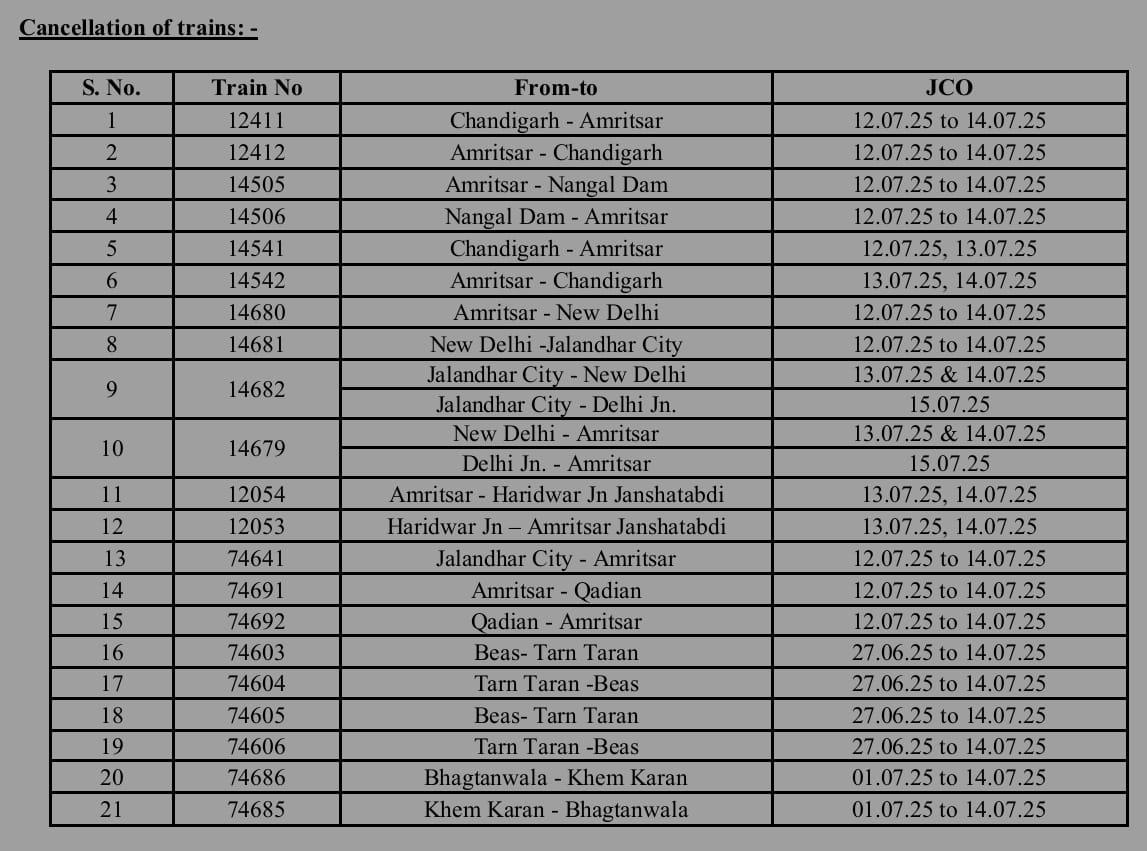 ਇਨ੍ਹਾਂ ਰੇਲ ਗੱਡੀਆਂ ਵਿੱਚ ਚੰਡੀਗੜ੍ਹ ਤੋਂ ਅੰਮ੍ਰਿਤਸਰ, ਇੰਟਰਸਿਟੀ ਐਕਸਪ੍ਰੈਸ ਨਵੀਂ ਦਿੱਲੀ ਤੋਂ ਅੰਮ੍ਰਿਤਸਰ, ਅੰਮ੍ਰਿਤਸਰ ਤੋਂ ਹਰਿਦੁਆਰ ਜਨਸ਼ਤਾਬਦੀ, ਜਲੰਧਰ ਸਿਟੀ ਤੋਂ ਅੰਮ੍ਰਿਤਸਰ ਆਦਿ ਸ਼ਾਮਲ ਹਨ। ਇਸ ਤੋਂ ਇਲਾਵਾ ਕਈ ਟਰੇਨਾਂ 14 ਦਿਨਾਂ ਤੱਕ ਬੰਦ ਰਹਿਣਗੀਆਂ।