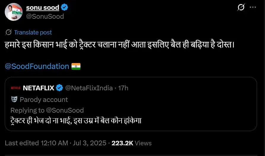 ਲਾਤੂਰ ਜ਼ਿਲ੍ਹੇ ਦੇ ਹਦੋਲਤੀ ਪਿੰਡ ਦੇ ਇੱਕ ਕਿਸਾਨ ਦਾ ਵੀਡੀਓ ਇੰਟਰਨੈੱਟ 'ਤੇ ਵਾਇਰਲ ਹੋ ਗਿਆ ਹੈ। ਇਸ ਵੀਡੀਓ ਵਿੱਚ ਕਿਸਾਨ ਖੁਦ ਹੀ ਬਲਦ ਦੀ ਜਗ੍ਹਾ ਹਲ ਵਾਹ ਰਿਹਾ ਹੈ। ਜਦੋਂ ਸੋਨੂੰ ਸੂਦ ਨੇ ਇਹ ਵੀਡੀਓ ਦੇਖਿਆ ਤਾਂ ਉਸਨੇ ਇੰਸਟਾਗ੍ਰਾਮ 'ਤੇ ਪੋਸਟ ਕੀਤਾ। ਉਸਨੇ ਲਿਖਿਆ 'ਤੁਸੀਂ ਨੰਬਰ ਭੇਜੋ, ਅਸੀਂ ਬਲਦ ਭੇਜਾਂਗੇ।' ਇੰਨਾ ਹੀ ਨਹੀਂ, ਇੱਕ ਯੂਜ਼ਰ ਨੇ ਕਿਹਾ ਕਿ ਬਲਦ ਦੀ ਬਜਾਏ ਟਰੈਕਟਰ ਭੇਜੋ। ਇਸ 'ਤੇ ਸੋਨੂੰ ਸੂਦ ਨੇ ਕਿਹਾ, 'ਸਾਡਾ ਇਹ ਕਿਸਾਨ ਟਰੈਕਟਰ ਚਲਾਉਣਾ ਨਹੀਂ ਜਾਣਦਾ, ਇਸ ਲਈ ਬਲਦ ਬੇਹਤਰ ਹੈ ਦੋਸਤ।'