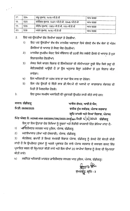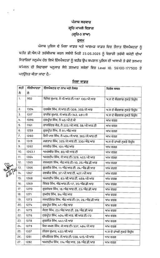 ਸਬੰਧਤ ਪੁਲਿਸ ਦਫਤਰਾਂ ਨੂੰ ਇੱਕ ਹਫ਼ਤੇ ਦੇ ਅੰਦਰ ਤਰੱਕੀ ਆਦੇਸ਼ਾਂ ਨੂੰ ਲਾਗੂ ਕਰਨ ਦੀ ਰਿਪੋਰਟ ਭੇਜਣ ਦੇ ਨਿਰਦੇਸ਼ ਦਿੱਤੇ ਗਏ ਹਨ।