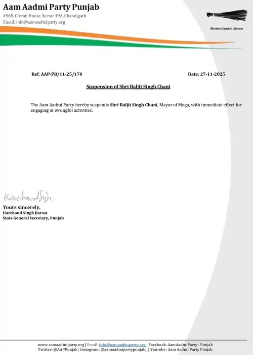 AAP Expels Moga Mayor : ਆਮ ਆਦਮੀ ਪਾਰਟੀ ਨੇ ਮੋਗਾ ਦੇ ਮੇਅਰ ਬਲਜੀਤ ਸਿੰਘ ਚਾਨੀ ਨੂੰ ਨਸ਼ਾ ਤਸਕਰਾਂ ਨਾਲ ਸਬੰਧਾਂ ਦੇ ਚੱਲਦਿਆਂ ਪਾਰਟੀ ਵਿੱਚੋਂ ਬਾਹਰ ਕੱਢਿਆ ਹੈ। ਉਨ੍ਹਾਂ ਨੂੰ ਮੇਅਰ ਦੇ ਅਹੁਦੇ ਤੋਂ ਅਸਤੀਫਾ ਦੇਣ ਲਈ ਵੀ ਕਿਹਾ ਗਿਆ ਹੈ। ਆਰੋਪ ਹੈ ਕਿ ਮੇਅਰ ਨੇ ਇੱਕ ਔਰਤ ਨੂੰ ਅਪਰਾਧਿਕ ਮਾਮਲੇ ਤੋਂ ਬਚਾਉਣ ਦੇ ਬਦਲੇ ਪੈਸੇ ਲਏ ਸਨ, ਜਿਸ ਤੋਂ ਬਾਅਦ ਮਾਮਲਾ ਸਾਹਮਣੇ ਆਇਆ ਅਤੇ ਪਾਰਟੀ ਨੇ ਕਾਰਵਾਈ ਕੀਤੀ