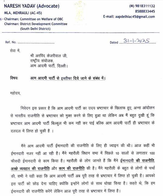 ਵਿਧਾਇਕ ਨਰੇਸ਼ ਯਾਦਵ ਨੇ ਪਾਰਟੀ ਸੁਪਰੀਮੋ ਅਰਵਿੰਦ ਕੇਜਰੀਵਾਲ ਨੂੰ ਭੇਜੇ ਅਸਤੀਫੇ ਪੱਤਰ 'ਚ ਲਿਖਿਆ, ''ਆਮ ਆਦਮੀ ਪਾਰਟੀ ਦਾ ਜਨਮ ਭ੍ਰਿਸ਼ਟਾਚਾਰ ਦੇ ਖਿਲਾਫ, ਭਾਰਤ ਦੀ ਰਾਜਨੀਤੀ ਨੂੰ ਭ੍ਰਿਸ਼ਟਾਚਾਰ ਮੁਕਤ ਕਰਨ ਲਈ ਅੰਨਾ ਅੰਦੋਲਨ ਕਰਕੇ ਹੋਇਆ ਸੀ ਪਰ ਹੁਣ ਮੈਨੂੰ ਇਸ ਗੱਲ ਦਾ ਬਹੁਤ ਦੁੱਖ ਹੈ ਕਿ ਆਮ ਆਦਮੀ ਪਾਰਟੀ ਭ੍ਰਿਸ਼ਟਾਚਾਰ ਨੂੰ ਬਿਲਕੁਲ ਵੀ ਘੱਟ ਨਹੀਂ ਕਰ ਸਕੀ ਸਗੋਂ ਆਮ ਆਦਮੀ ਪਾਰਟੀ ਪਹਿਲਾਂ ਹੀ ਹੋ ਚੁੱਕੀ ਹੈ। ਭ੍ਰਿਸ਼ਟਾਚਾਰ ਦੀ ਦਲਦਲ ਵਿੱਚ ਫਸ ਗਿਆ।''