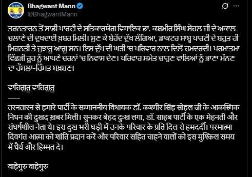 ਮੁੱਖ ਮੰਤਰੀ ਨੇ ਸੰਦੇਸ਼ 'ਤੇ ਲਿਖਿਆ- ਸਾਡੀ ਪਾਰਟੀ ਦੇ ਤਰਨਤਾਰਨ ਤੋਂ ਸਤਿਕਾਰਯੋਗ ਵਿਧਾਇਕ ਡਾ. ਕਸ਼ਮੀਰ ਸਿੰਘ ਸੋਹਲ ਦੇ ਅਚਾਨਕ ਦਿਹਾਂਤ ਦੀ ਦੁਖਦਾਈ ਖ਼ਬਰ ਮਿਲੀ। ਮੈਨੂੰ ਇਹ ਸੁਣ ਕੇ ਬਹੁਤ ਦੁੱਖ ਹੋਇਆ, ਉਹ ਪਾਰਟੀ ਦੇ ਇੱਕ ਮਿਹਨਤੀ ਅਤੇ ਸੰਘਰਸ਼ਸ਼ੀਲ ਨੇਤਾ ਸਨ। ਇਸ ਦੁਖਦਾਈ ਘੜੀ ਵਿੱਚ ਉਨ੍ਹਾਂ ਦੇ ਪਰਿਵਾਰ ਨਾਲ ਦਿਲੋਂ ਹਮਦਰਦੀ ਹੈ। ਪਰਮਾਤਮਾ ਵਿਛੜੀ ਆਤਮਾ ਨੂੰ ਸ਼ਾਂਤੀ ਦੇਵੇ ਅਤੇ ਇਸ ਔਖੇ ਸਮੇਂ ਵਿੱਚ ਪਰਿਵਾਰ ਅਤੇ ਅਜ਼ੀਜ਼ਾਂ ਨੂੰ ਧੀਰਜ ਅਤੇ ਹਿੰਮਤ ਦੇਵੇ।
