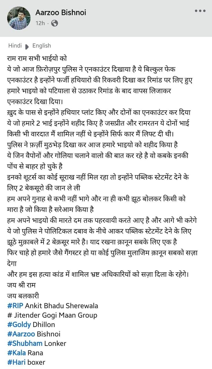 Abohar Murder Case ‘ਚ ਆਇਆ ਨਵਾਂ ਮੋੜ ,Aarzo Bishnoi ਪੇਜ ਤੋਂ ਪਾਈ ਗਈ ਨਵੀਂ ਪੋਸਟ ,ਪੁਲਿਸ ਐਨਕਾਉਂਟਰ ਨੂੰ ਦੱਸਿਆ ਫਰਜੀ
