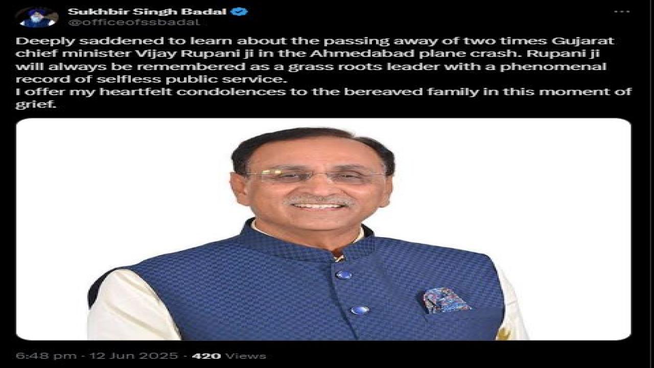 ਗੁਜਰਾਤ ਦੇ ਸਾਬਕਾ CM ਵਿਜੇ ਰੁਪਾਣੀ ਦੀ ਮੌਤ 'ਤੇ ਸੁਖਬੀਰ ਸਿੰਘ ਬਾਦਲ ਨੇ ਪ੍ਰਗਟਾਇਆ ਦੁੱਖ, ਸ਼੍ਰੋਮਣੀ ਅਕਾਲੀ ਦਲ ਦੇ ਪ੍ਰਧਾਨ ਨੇ ਕਿਹਾ ਕਿ - ਜ਼ਮੀਨ ਨਾਲ ਜੁੜੇ ਹੋਏ ਨੇਤਾ ਸਨ ਰੁਪਾਣੀ