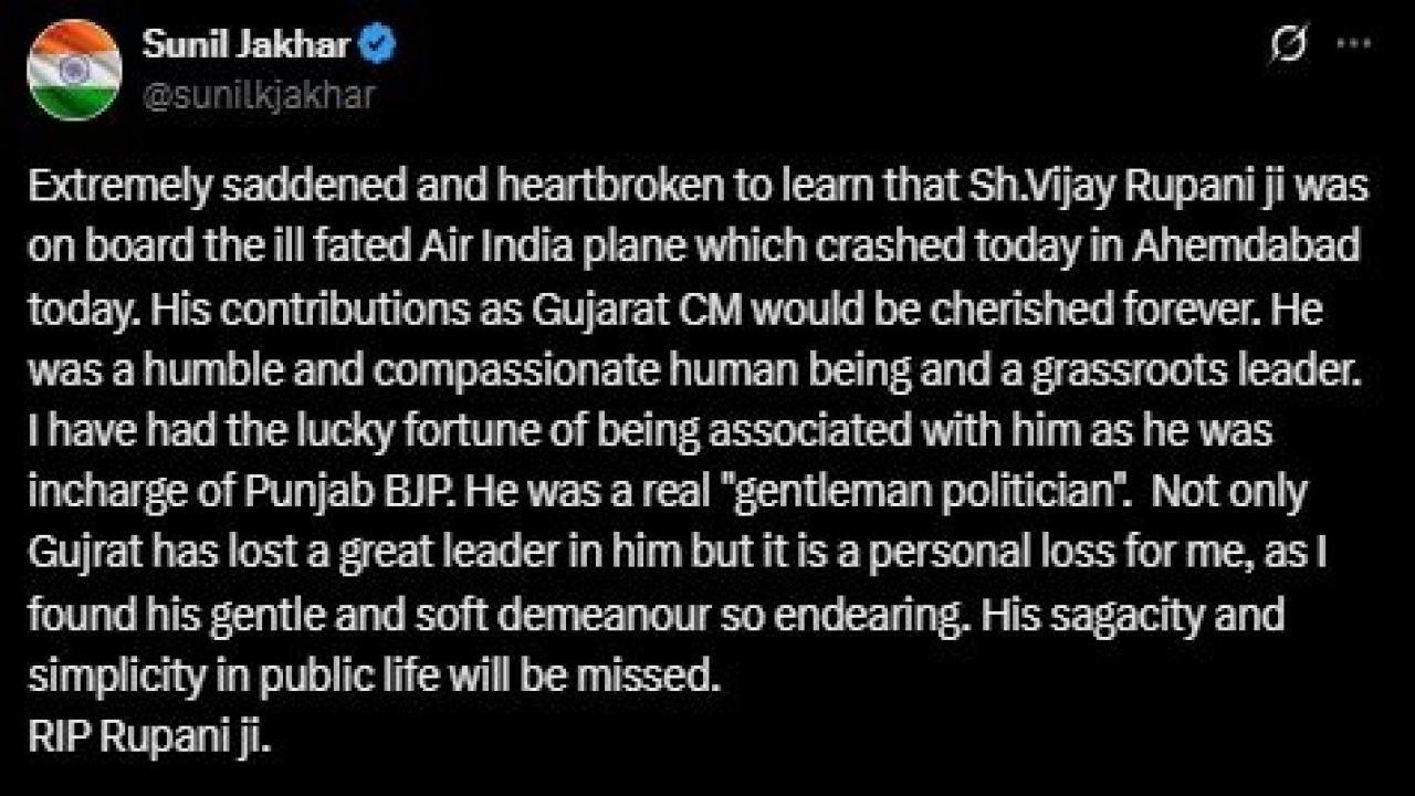 Ahmedabad Plane Crash Live Updates : ਗੁਜਰਾਤ ਦੇ ਸਾਬਕਾ ਸੀਐਮ ਵਿਜੇ ਰੁਪਾਣੀ ਦੀ ਜਹਾਜ਼ ਹਾਦਸੇ 'ਚ ਹੋਈ ਮੌਤ, ਸੁਨੀਲ ਜਾਖੜ ਨੇ ਜਤਾਇਆ ਦੁੱਖ
