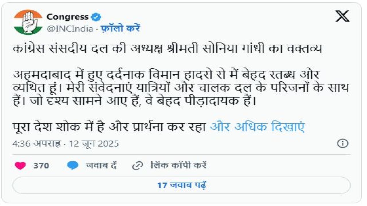 ਕਾਂਗਰਸ ਪ੍ਰਧਾਨ ਮੱਲਿਕਾਰਜੁਨ ਖੜਗੇ ਕਹਿੰਦੇ ਹਨ, "... ਮੈਂ ਉਨ੍ਹਾਂ ਲੋਕਾਂ ਨੂੰ ਸ਼ਰਧਾਂਜਲੀ ਅਤੇ ਸੰਵੇਦਨਾ ਦਿੰਦਾ ਹਾਂ ਜਿਨ੍ਹਾਂ ਦੀ ਮੌਤ ਹੋ ਗਈ ਹੈ। ਸਰਕਾਰ ਨੂੰ ਤੁਰੰਤ ਉਨ੍ਹਾਂ ਲੋਕਾਂ ਦੇ ਪਰਿਵਾਰਾਂ ਦੀ ਮਦਦ ਕਰਨੀ ਚਾਹੀਦੀ ਹੈ ਜਿਨ੍ਹਾਂ ਦੀ ਮੌਤ ਹੋ ਗਈ ਹੈ, ਅਤੇ ਉਸ ਖੇਤਰ ਦੇ ਲੋਕਾਂ ਦੀ ਵੀ ਜਿੱਥੇ ਜਹਾਜ਼ ਹਾਦਸਾਗ੍ਰਸਤ ਹੋਇਆ ਹੈ... ਕਾਂਗਰਸ ਨੇਤਾ ਵੀ ਇਸ ਘਟਨਾ ਨੂੰ ਸੰਭਾਲਣ ਵਿੱਚ ਲੋਕਾਂ ਦੀ ਮਦਦ ਕਰਨਗੇ। ਇਸ ਹਾਦਸੇ ਦੀ ਜਾਂਚ ਹੋਣੀ ਚਾਹੀਦੀ ਹੈ..."