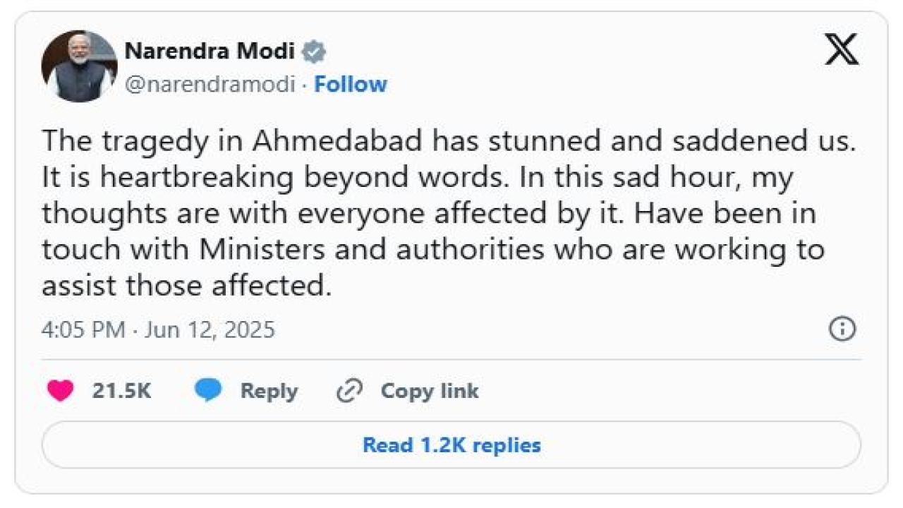 ???? ਅਹਿਮਦਾਬਾਦ ਵਿੱਚ ਹੋਏ ਜਹਾਜ਼ ਹਾਦਸੇ ਦੀ ਖ਼ਬਰ ਤੋਂ ਬਹੁਤ ਦੁੱਖ ਹੋਇਆ। ਜਹਾਜ਼ ਵਿੱਚ ਸਵਾਰ ਸਾਰੇ ਲੋਕਾਂ ਦੀ ਸੁਰੱਖਿਆ ਅਤੇ ਪ੍ਰਭਾਵਿਤ ਪਰਿਵਾਰਾਂ ਨੂੰ ਸ਼ਕਤੀ ਦੇਣ ਲਈ ਪ੍ਰਾਰਥਨਾ ਕਰਦਾ ਹਾਂ।