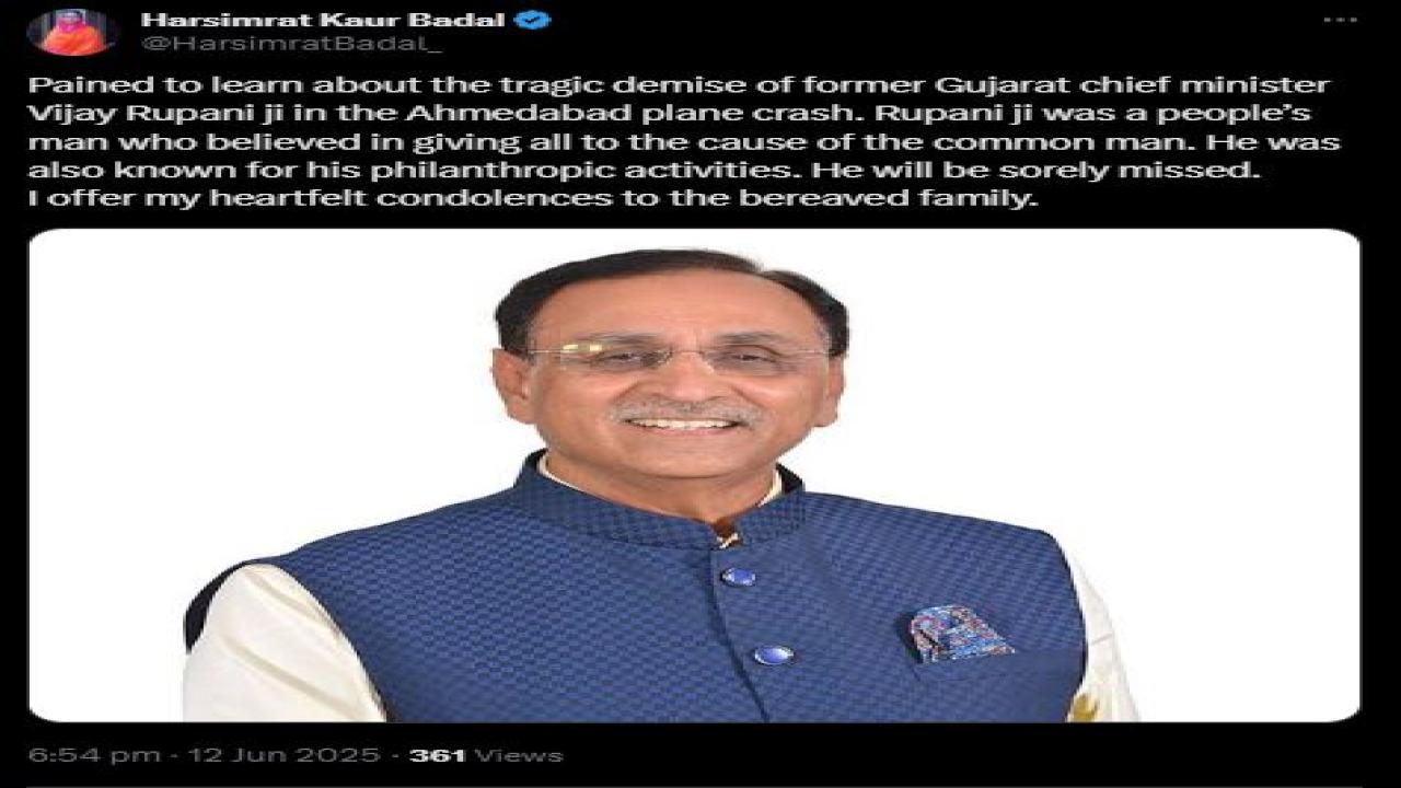 ਗੁਜਰਾਤ ਦੇ ਸਾਬਕਾ CM ਵਿਜੇ ਰੁਪਾਣੀ ਦੀ ਮੌਤ 'ਤੇ MP ਹਰਸਿਮਰਤ ਕੌਰ ਬਾਦਲ ਨੇ ਪ੍ਰਗਟਾਇਆ ਦੁੱਖ