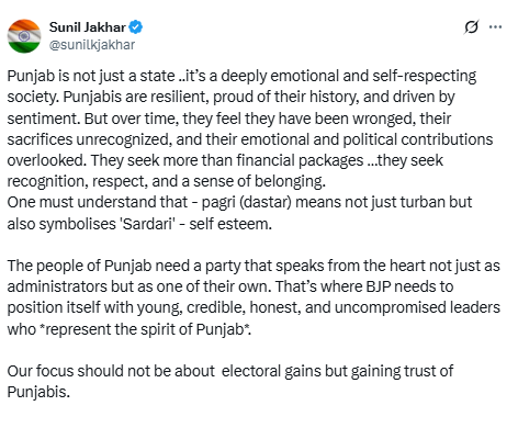ਸੁਨੀਲ ਜਾਖੜ ਨੇ ਸੋਸ਼ਲ ਮੀਡੀਆ ਐਕਸ ’ਤੇ ਕਿਹਾ ਕਿ ਪਾਰਟੀ ਨੂੰ ਲੋਕਾਂ ਦਾ ਵਿਸ਼ਵਾਸ ਜਿੱਤਣਾ ਚਾਹੀਦਾ ਹੈ, ਨਾ ਕਿ ਪੰਜਾਬ ਵਿੱਚ ਚੋਣਾਂ। ਪੰਜਾਬ ਸਿਰਫ਼ ਜ਼ਮੀਨ ਦਾ ਟੁਕੜਾ ਨਹੀਂ ਹੈ, ਪਰ ਇੱਥੋਂ ਦੇ ਲੋਕ ਆਪਣੇ ਸਨਮਾਨ ਅਤੇ ਸੱਭਿਆਚਾਰ ਨੂੰ ਬਹੁਤ ਮਹੱਤਵ ਦਿੰਦੇ ਹਨ। 'ਪਗੜੀ' ਅਤੇ 'ਦਸਤਾਰ' ਇੱਥੇ ਸਿਰਫ਼ ਇੱਕ ਪਹਿਰਾਵਾ ਨਹੀਂ ਹੈ, ਸਗੋਂ ਸਵੈ-ਮਾਣ ਦਾ ਪ੍ਰਤੀਕ ਹੈ।