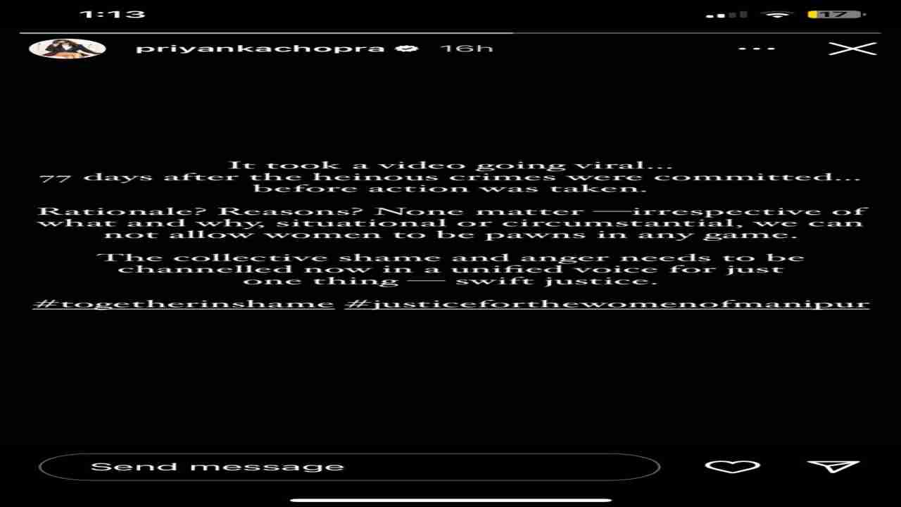 ਪ੍ਰਿਯੰਕਾ ਨੇ ਆਪਣੀ ਪੋਸਟ 'ਚ ਅੱਗੇ ਲਿਖਿਆ, 'ਇਹ ਸਮੂਹਿਕ ਸ਼ਰਮ ਦਾ ਮਾਮਲਾ ਹੈ ਅਤੇ 'ਮਣੀਪੁਰ ਦੀਆਂ ਔਰਤਾਂ ਲਈ ਨਿਆਂ' ਹੋਣਾ ਚਾਹੀਦਾ ਹੈ। ਉਨ੍ਹਾਂ ਇਹ ਵੀ ਕਿਹਾ, "ਸਮੂਹਿਕ ਸ਼ਰਮ ਅਤੇ ਗੁੱਸੇ ਨੂੰ ਹੁਣ ਸਿਰਫ਼ ਇੱਕ ਚੀਜ਼ ਲਈ ਇੱਕਜੁੱਟ ਆਵਾਜ਼ ਵਿੱਚ ਉਠਾਉਣ ਦੀ ਲੋੜ ਹੈ - ਤੁਰੰਤ ਨਿਆਂ।"