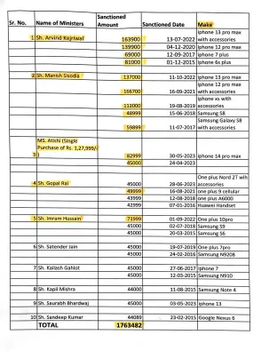 ਦਿੱਲੀ ਸਰਕਾਰ ਦੁਆਰਾ ਜਾਰੀ ਕੀਤੀ ਗਈ ਸੂਚੀ ਵਿੱਚ ਦਾਅਵਾ ਕੀਤਾ ਗਿਆ ਹੈ ਕਿ ਅਰਵਿੰਦ ਕੇਜਰੀਵਾਲ ਨੇ ਆਪਣੇ ਕਾਰਜਕਾਲ ਦੌਰਾਨ ਚਾਰ ਫੋਨ ਖਰੀਦੇ ਸਨ। ਉਨ੍ਹਾਂ ਵਿੱਚੋਂ ਸਭ ਤੋਂ ਮਹਿੰਗਾ ਫੋਨ 1 ਲੱਖ 63 ਹਜ਼ਾਰ ਰੁਪਏ ਦਾ ਸੀ। ਇਸ ਤੋਂ ਇਲਾਵਾ ਮਨੀਸ਼ ਸਿਸੋਦੀਆ ਨੇ ਕਈ ਮਹਿੰਗੇ ਫੋਨ ਵੀ ਖਰੀਦੇ ਸਨ, ਜਿਨ੍ਹਾਂ ਦੀ ਕੀਮਤ ਇੱਕ ਲੱਖ ਰੁਪਏ ਤੋਂ ਵੱਧ ਸੀ।
