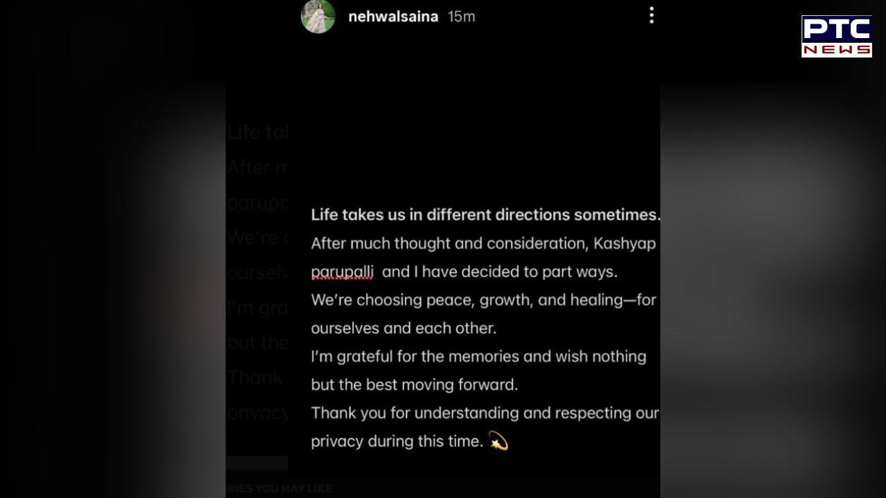 ਦੋ ਵਾਰ ਦੀ ਰਾਸ਼ਟਰਮੰਡਲ ਖੇਡਾਂ ਦੀ ਚੈਂਪੀਅਨ ਸਾਇਨਾ ਨੇ ਲਿਖਿਆ, "ਜ਼ਿੰਦਗੀ ਕਈ ਵਾਰ ਸਾਨੂੰ ਵੱਖ-ਵੱਖ ਦਿਸ਼ਾਵਾਂ ਵਿੱਚ ਲੈ ਜਾਂਦੀ ਹੈ। ਬਹੁਤ ਸੋਚ-ਵਿਚਾਰ ਤੋਂ ਬਾਅਦ, ਕਸ਼ਯਪ ਪਾਰੂਪੱਲੀ ਅਤੇ ਮੈਂ ਵੱਖ ਹੋਣ ਦਾ ਫੈਸਲਾ ਕੀਤਾ ਹੈ। ਅਸੀਂ ਆਪਣੇ ਅਤੇ ਇੱਕ ਦੂਜੇ ਲਈ ਸ਼ਾਂਤੀ, ਵਿਕਾਸ ਅਤੇ ਇਲਾਜ ਦੀ ਚੋਣ ਕਰ ਰਹੇ ਹਾਂ।"