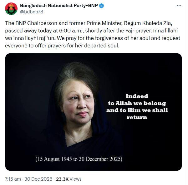 ਖਾਲਿਦਾ ਜ਼ਿਆ ਦੀ ਪਾਰਟੀ, ਬੀਐਨਪੀ ਨੇ ਉਨ੍ਹਾਂ ਦੀ ਮੌਤ ਦੀ ਪੁਸ਼ਟੀ ਕੀਤੀ ਹੈ। ਸੋਸ਼ਲ ਮੀਡੀਆ ਪਲੇਟਫਾਰਮ 'ਤੇ ਇੱਕ ਪੋਸਟ ਵਿੱਚ ਬੀਐਨਪੀ ਨੇ ਕਿਹਾ ਕਿ ਡਾਕਟਰਾਂ ਨੇ ਉਨ੍ਹਾਂ ਨੂੰ ਥੋੜ੍ਹੀ ਦੇਰ ਪਹਿਲਾਂ ਮ੍ਰਿਤਕ ਐਲਾਨ ਦਿੱਤਾ ਸੀ। ਉਨ੍ਹਾਂ ਨੇ ਸਵੇਰੇ 6 ਵਜੇ ਆਖਰੀ ਸਾਹ ਲਿਆ। ਉਹ ਲੰਬੇ ਸਮੇਂ ਤੋਂ ਬਿਮਾਰ ਸਨ ਅਤੇ ਢਾਕਾ ਦੇ ਐਵਰ ਕੇਅਰ ਹਸਪਤਾਲ ਵਿੱਚ ਇਲਾਜ ਅਧੀਨ ਸਨ।