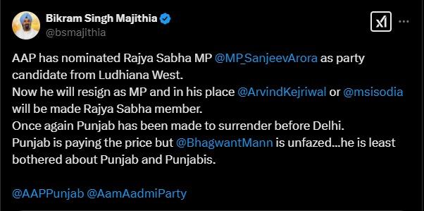 ਸ਼੍ਰੋਮਣੀ ਅਕਾਲੀ ਦਲ ਦੇ ਸੀਨੀਅਰ ਆਗੂ ਬਿਕਰਮ ਸਿੰਘ ਮਜੀਠੀਆ ਨੇ ਵੀ ਸੰਜੀਵ ਅਰੋੜਾ ਨੂੰ ਉਮੀਦਵਾਰ ਬਣਾਏ ਜਾਣ 'ਤੇ ਆਪਣੇ ਟਵਿੱਟਰ ਅਕਾਊਂਟ ਐਕਸ ਰਾਹੀਂ ਨਿਸ਼ਾਨਾ ਲਾਉਂਦੇ ਕਿਹਾ, ''ਅਰਵਿੰਦ ਕੇਜਰੀਵਾਲ ਦੀ ਸੱਤਾ ਲਈ ਲਾਲਸਾ ਬੇਨਕਾਬ ਹੋ ਗਈ ਹੈ। ਆਮ ਆਦਮੀ ਪਾਰਟੀ ਨੇ ਰਾਜ ਸਭਾ ਮੈਂਬਰ ਸੰਜੀਵ ਅਰੋੜਾ ਨੂੰ ਲੁਧਿਆਣਾ ਪੱਛਮੀ ਤੋਂ ਉਮੀਦਵਾਰ ਬਣਾ ਦਿੱਤਾ ਹੈ।