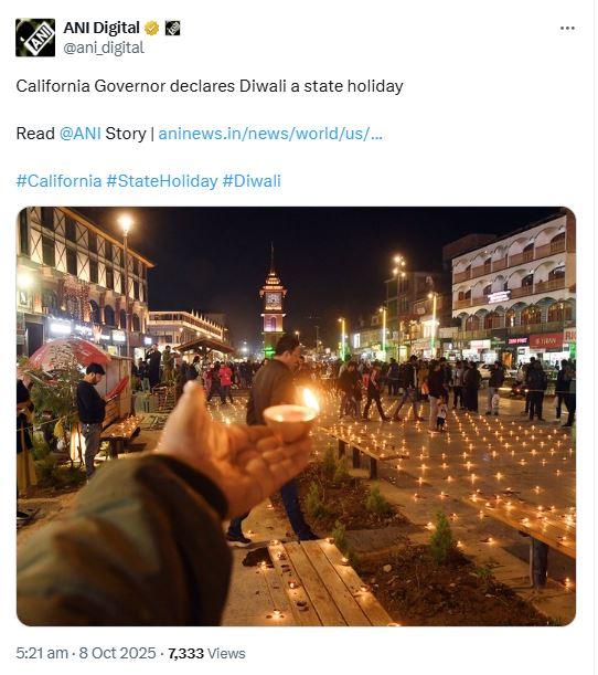Diwali : ਇਹ ਭਾਰਤੀ ਪ੍ਰਵਾਸੀਆਂ ਲਈ ਇੱਕ ਇਤਿਹਾਸਕ ਪਲ ਹੈ। ਇਹ ਚੰਗੀ ਖ਼ਬਰ ਹੈ ਕਿ ਕੈਲੀਫੋਰਨੀਆ ਨੇ ਦੀਵਾਲੀ ਨੂੰ ਸਰਕਾਰੀ ਛੁੱਟੀ ਘੋਸ਼ਿਤ ਕੀਤੀ ਹੈ। ਇਸ ਤਰ੍ਹਾਂ, ਇਹ ਅਮਰੀਕਾ ਦਾ ਤੀਜਾ ਰਾਜ ਬਣ ਗਿਆ ਹੈ ਜਿਸਨੇ ਅਧਿਕਾਰਤ ਤੌਰ 'ਤੇ ਦੀਵਾਲੀ ਨੂੰ ਸਰਕਾਰੀ ਛੁੱਟੀ ਘੋਸ਼ਿਤ ਕੀਤੀ ਹੈ।