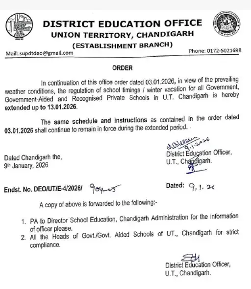 Chandigarh Schools extended holidays : ਚੰਡੀਗੜ੍ਹ ਦੇ ਸਾਰੇ ਸਕੂਲ ਹੁਣ 13 ਜਨਵਰੀ ਤੱਕ ਬੰਦ ਰਹਿਣਗੇ। ਚੰਡੀਗੜ੍ਹ ਸਿੱਖਿਆ ਵਿਭਾਗ ਨੇ ਸਰਦੀਆਂ ਦੀਆਂ ਛੁੱਟੀਆਂ 13 ਜਨਵਰੀ ਤੱਕ ਵਧਾ ਦਿੱਤੀਆਂ ਹਨ। ਸਕੂਲ ਪਹਿਲਾਂ ਕੱਲ੍ਹ 10 ਜਨਵਰੀ ਨੂੰ ਦੁਬਾਰਾ ਖੁੱਲ੍ਹਣੇ ਸਨ। ਚੰਡੀਗੜ੍ਹ ਸਿੱਖਿਆ ਵਿਭਾਗ ਦੇ ਅਨੁਸਾਰ ਇਹ ਫੈਸਲਾ ਮੌਸਮ ਦੇ ਕਾਰਨ ਲਿਆ ਗਿਆ ਹੈ। ਇਹ ਹੁਕਮ ਸਾਰੇ ਸਰਕਾਰੀ, ਸਰਕਾਰੀ ਸਹਾਇਤਾ ਪ੍ਰਾਪਤ ਅਤੇ ਨਿੱਜੀ ਸਕੂਲਾਂ 'ਤੇ ਲਾਗੂ ਹੁੰਦਾ ਹੈ।