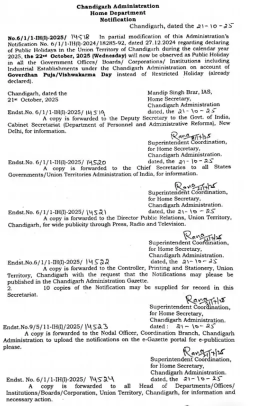 Chandigarh Holiday News : ਚੰਡੀਗੜ੍ਹ ਵਿੱਚ ਬੁੱਧਵਾਰ ਯਾਨੀ ਭਲਕੇ (22 ਅਕਤੂਬਰ) ਗੋਵਰਧਨ ਪੂਜਾ ਅਤੇ ਵਿਸ਼ਵਕਰਮਾ ਦਿਵਸ ਕਾਰਨ ਸਰਕਾਰੀ ਛੁੱਟੀ ਰਹੇਗੀ। ਚੰਡੀਗੜ੍ਹ ਪ੍ਰਸ਼ਾਸਨ ਨੇ ਮੰਗਲਵਾਰ (21 ਅਕਤੂਬਰ) ਨੂੰ ਇੱਕ ਨੋਟੀਫਿਕੇਸ਼ਨ ਜਾਰੀ ਕੀਤਾ ਹੈ। ਇਸ ਸਮੇਂ ਦੌਰਾਨ ਚੰਡੀਗੜ੍ਹ ਦੇ ਸਾਰੇ ਸਰਕਾਰੀ ਦਫ਼ਤਰ, ਬੋਰਡ ਅਤੇ ਕਾਰਪੋਰੇਸ਼ਨ ਬੰਦ ਰਹਿਣਗੇ। ਗ੍ਰਹਿ ਸਕੱਤਰ ਮਨਦੀਪ ਬਰਾੜ ਨੇ ਇਸ ਸਬੰਧ ਵਿੱਚ ਹੁਕਮ ਜਾਰੀ ਕੀਤੇ ਹਨ।