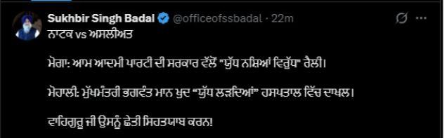 ਉਨ੍ਹਾਂ ਲਿਖਿਆ ਕਿ ਇੱਕ ਪਾਸੇ ਮੋਗਾ 'ਚ 'ਆਪ' ਵੱਲੋਂ ਕੀਤੀ ਜਾ ਰਹੀ 'ਯੁੱਧ ਨਸ਼ਿਆਂ ਵਿਰੁੱਧ' ਰੈਲੀ ਕੀਤੀ ਜਾ ਰਹੀ ਹੈ, ਉਥੇ ਹੀ ਦੂਜੇ ਪਾਸੇ ਨਸ਼ਿਆਂ ਵਿਰੁੱਧ ਯੁੱਧ ਲੜਦਿਆਂ ਸੀਐਮ ਮਾਨ ਖੁਦ ਹਸਪਤਾਲ ਦਾਖਲ ਹੋਏ ਹਨ। ਅਕਾਲੀ ਦਲ ਦੇ ਪ੍ਰਧਾਨ ਵੱਲੋਂ ਸੀਐਮ ਮਾਨ ਦੀ ਸਿਹਤਯਾਬੀ ਦੀ ਅਰਦਾਸ ਵੀ ਕੀਤੀ ਗਈ।
