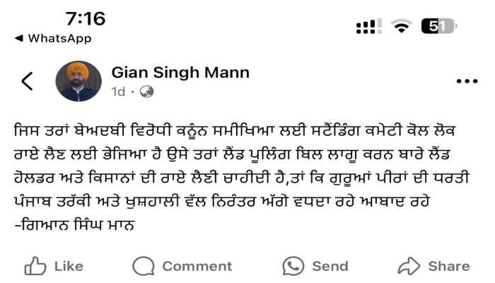 ਗਿਆਨ ਸਿੰਘ ਮਾਨ ਨੇ ਲਿਖਿਆ ਹੈ ਕਿ ਜਿਸ ਤਰਾਂ ਬੇਅਦਬੀ ਵਿਰੋਧੀ ਕਨੂੰਨ ਸਮੀਖਿਆ ਲਈ ਸਟੈਂਡਿੰਗ ਕਮੇਟੀ ਕੋਲ ਲੋਕ ਰਾਏ ਲੈਣ ਲਈ ਭੇਜਿਆ ਹੈ। ਉਸੇ ਤਰ੍ਹਾਂ ਲੈਂਡ ਪੂਲਿੰਗ ਬਿੱਲ ਲਾਗੂ ਕਰਨ ਬਾਰੇ ਲੈਂਡ ਹੋਲਡਰ ਅਤੇ ਕਿਸਾਨਾਂ ਦੀ ਰਾਏ ਲੈਣੀ ਚਾਹੀਦੀ ਹੈ ਤਾਂ ਕਿ ਗੁਰੂਆਂ ਪੀਰਾਂ ਦੀ ਧਰਤੀ ਪੰਜਾਬ ਤਰੱਕੀ ਅਤੇ ਖੁਸ਼ਹਾਲੀ ਵੱਲ ਨਿਰੰਤਰ ਅੱਗੇ ਵਧਦਾ ਰਹੇ ਆਬਾਦ ਰਹੇ।