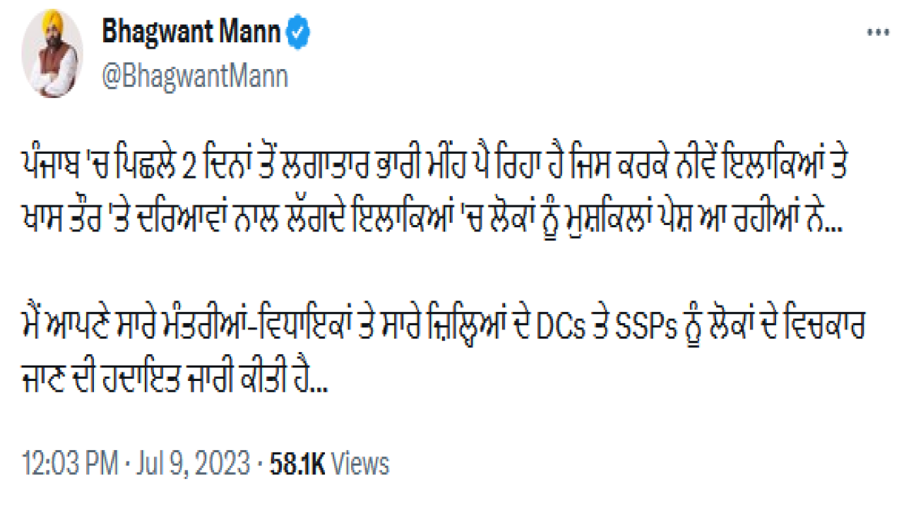 ਸੀਐੱਮ ਭਗਵੰਤ ਮਾਨ ਨੇ ਕਿਹਾ ਕਿ ਸਾਰੇ ਮੰਤਰੀਆਂ ਅਤੇ ਵਿਧਾਇਕਾਂ ਨੂੰ ਚਾਹੀਦਾ ਹੈ ਕਿ ਉਹ ਆਪੋ-ਆਪਣੇ ਹਲਕਿਆਂ ਖ਼ਾਸ ਕਰਕੇ ਨੀਵੇਂ ਅਤੇ ਹੜ੍ਹਾਂ ਵਾਲੇ ਇਲਾਕਿਆਂ ਦਾ ਦੌਰਾ ਕਰਨ ਤਾਂ ਜੋ ਲੋੜਵੰਦਾਂ ਦੀ ਮਦਦ ਯਕੀਨੀ ਬਣਾਈ ਜਾ ਸਕੇ।