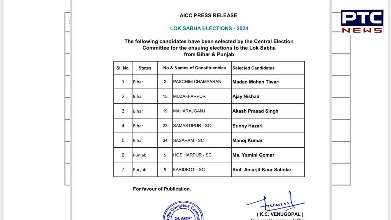 ਕਾਂਗਰਸ ਪਾਰਟੀ ਵੱਲੋਂ ਸੋਮਵਾਰ ਜਾਰੀ ਕੀਤੀ ਗਈ ਉਮੀਦਵਾਰਾਂ ਦੀ ਸੂਚੀ ਵਿੱਚ ਬਿਹਾਰ ਅਤੇ ਪੰਜਾਬ ਲਈ 7 ਉਮੀਦਵਾਰਾਂ ਦਾ ਐਲਾਨ ਕੀਤਾ ਗਿਆ ਹੈ।