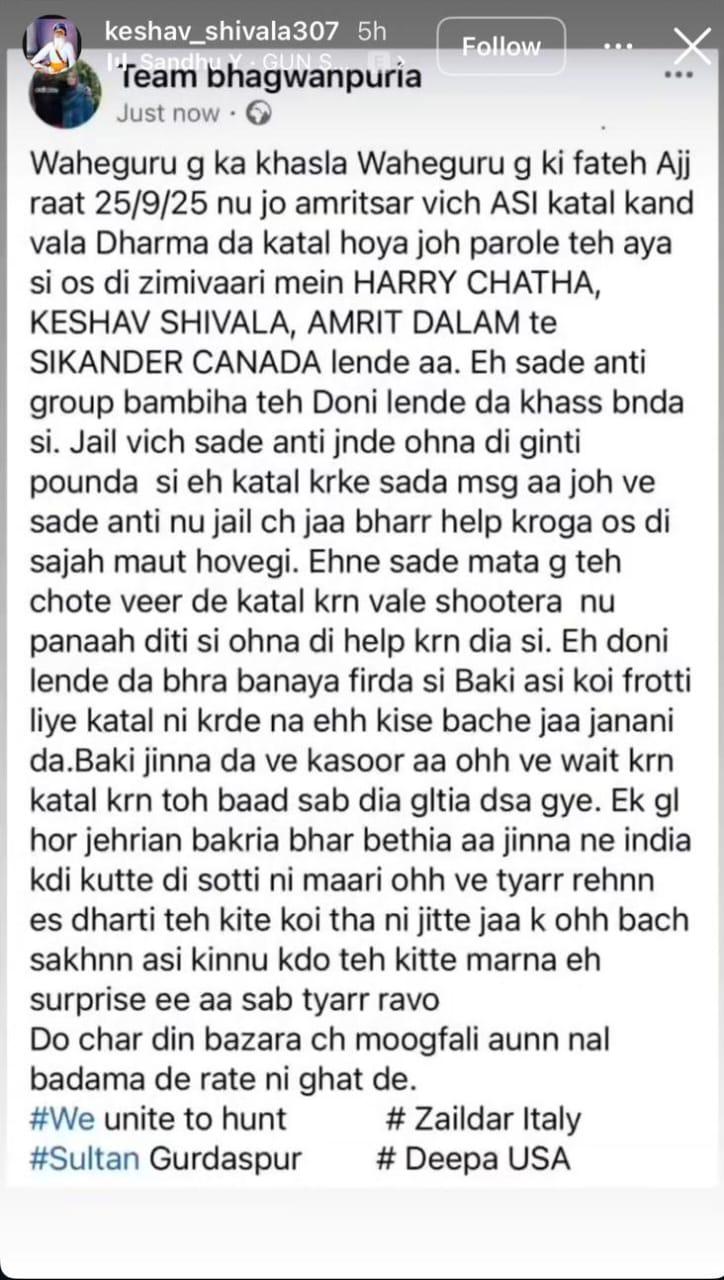 ਅਸੀਂ, ਹੈਰੀ ਚੱਠਾ, ਕੇਸ਼ਵ ਸ਼ਿਵਾਲਾ, ਅੰਮ੍ਰਿਤ ਦਾਲਮ, ਅਤੇ ਸਿਕੰਦਰ ਕੈਨੇਡਾ, ਅੱਜ, 9/25/2025 ਨੂੰ ਅੰਮ੍ਰਿਤਸਰ ਵਿੱਚ ਇੱਕ ਧਾਰਮਿਕ ਵਿਅਕਤੀ ਦੇ ਕੀਤੇ ਗਏ ਕਤਲ ਦੀ ਜ਼ਿੰਮੇਵਾਰੀ ਲੈਂਦੇ ਹਾਂ, ਜੋ ਪੈਰੋਲ 'ਤੇ ਸੀ। ਉਹ ਸਾਡੇ ਦੇਸ਼ ਵਿਰੋਧੀ ਸਮੂਹ, ਬੰਬੀਹਾ ਦੇ ਮੈਂਬਰ ਹਨ, ਅਤੇ ਡੋਨੀ ਲਹਿੰਦੇ ਦੇ ਨਜ਼ਦੀਕੀ ਸਾਥੀ ਸਨ। ਉਹ ਜੇਲ੍ਹ ਦੇ ਅੰਦਰ ਸਾਡੇ ਵਿਰੋਧੀਆਂ ਦੀ ਗਿਣਤੀ ਰੱਖਦਾ ਸੀ। ਇਸ ਕਤਲ ਨੇ ਇੱਕ ਸੁਨੇਹਾ ਭੇਜਿਆ ਹੈ ਕਿ ਜੋ ਵੀ ਸਾਡੇ ਵਿਰੋਧੀਆਂ ਨੂੰ ਜੇਲ੍ਹ ਵਿੱਚ ਜਾਂ ਬਾਹਰ ਰੱਖਦਾ ਹੈ ਉਸਨੂੰ ਮੌਤ ਦੀ ਸਜ਼ਾ ਦਿੱਤੀ ਜਾਵੇਗੀ। ਉਨ੍ਹਾਂ ਨੇ ਸਾਡੀ ਮਾਂ ਅਤੇ ਸਾਡੇ ਛੋਟੇ ਭਰਾ, ਵੀਰ ਨੂੰ ਮਾਰਨ ਵਾਲੇ ਸ਼ੂਟਰਾਂ ਨੂੰ ਪਨਾਹ ਦਿੱਤੀ ਅਤੇ ਸਹਾਇਤਾ ਕੀਤੀ। ਇਹ ਦੋਵੇਂ ਕਾਤਲ ਫਿਰ ਸਾਡੇ ਭਰਾ ਹੋਣ ਦਾ ਦਿਖਾਵਾ ਕਰਦੇ ਹਨ।