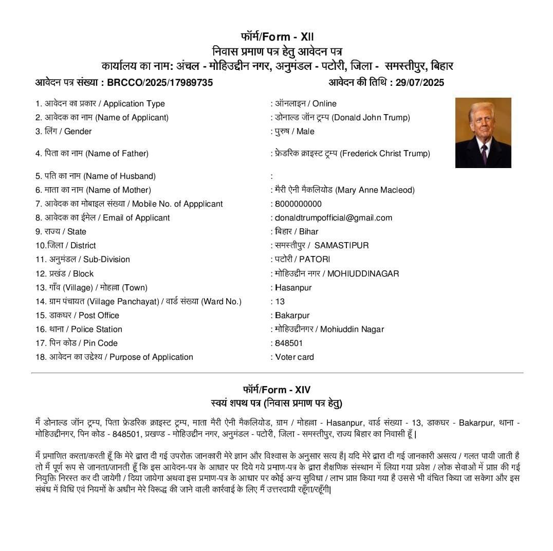 ਪ੍ਰਾਪਤ ਜਾਣਕਾਰੀ ਅਨੁਸਾਰ ਇਹ ਅਰਜ਼ੀ ਸਮਸਤੀਪੁਰ ਦੇ ਮੋਹੀਉਦੀਨ ਨਗਰ ਜ਼ੋਨ ਦੇ ਪਬਲਿਕ ਸਰਵਿਸ ਸੈਂਟਰ (RTPS) ਵਿਖੇ ਪ੍ਰਾਪਤ ਹੋਈ ਸੀ। ਅਰਜ਼ੀ ਵਿੱਚ ਡੋਨਾਲਡ ਟਰੰਪ ਦਾ ਪਤਾ ਪਿੰਡ ਹਸਨਪੁਰ, ਵਾਰਡ 13, ਡਾਕਘਰ ਬਾਕਰਪੁਰ, ਪੁਲਿਸ ਸਟੇਸ਼ਨ ਮੋਹੀਉਦੀਨ ਨਗਰ ਦਿੱਤਾ ਗਿਆ ਸੀ। ਅਰਜ਼ੀ ਫਾਰਮ 'ਤੇ ਡੋਨਾਲਡ ਟਰੰਪ ਦੀ ਫੋਟੋ, ਆਧਾਰ ਨੰਬਰ, ਬਾਰ ਕੋਡ ਅਤੇ ਪਤੇ 'ਚ ਬਦਲਾਵ ਕੀਤਾ ਗਿਆ ਹੈ। ਇਸ ਲਈ ਮਾਲ ਅਧਿਕਾਰੀ ਮੋਹੀਉਦੀਨ ਨਗਰ ਨੇ 4 ਅਗਸਤ 2025 ਨੂੰ ਅਰਜ਼ੀ ਰੱਦ ਕਰ ਦਿੱਤੀ। ਇਸ ਮਾਮਲੇ ਵਿੱਚ ਸਾਈਬਰ ਪੁਲਿਸ ਸਟੇਸ਼ਨ ਸਮਸਤੀਪੁਰ ਵਿੱਚ ਇੱਕ ਅਣਪਛਾਤੇ ਵਿਅਕਤੀ ਵਿਰੁੱਧ ਐਫਆਈਆਰ ਦਰਜ ਕੀਤੀ ਗਈ ਹੈ।