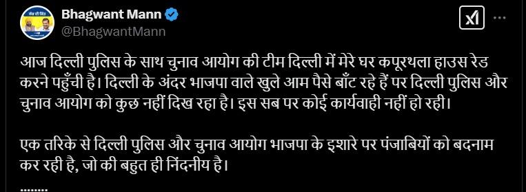 ਕਪੂਰਥਲਾ ਹਾਊਸ ਮਾਮਲੇ 'ਚ ਮੁੱਖ ਮੰਤਰੀ ਭਗਵੰਤ ਮਾਨ ਦੀ ਵੀ ਪਹਿਲੀ ਪ੍ਰਤੀਕਿਰਿਆ ਸਾਹਮਣੇ ਆਈ ਹੈ। ਉਨ੍ਹਾਂ ਆਪਣੇ ਟਵਿੱਟਰ ਅਕਾਊਂਟ ਐਕਸ 'ਤੇ ਲਿਖਿਆ, ''ਅੱਜ ਦਿੱਲੀ ਪੁਲਿਸ ਦੇ ਨਾਲ ਚੋਣ ਕਮਿਸ਼ਨ ਦੀ ਟੀਮ ਦਿੱਲੀ ਵਿੱਚ ਮੇਰੇ ਘਰ ਕਪੂਰਥਲਾ ਹਾਊਸ ਰੇਡ ਕਰਨ ਪਹੁੰਚੀ ਹੈ। ਦਿੱਲੀ 'ਚ ਬੀਜੇਪੀ ਵਾਲੇ ਸ਼ਰ੍ਹੇਆਮ ਪੈਸੇ ਵੰਡ ਰਹੇ ਨੇ ਪਰ ਦਿੱਲੀ ਪੁਲਿਸ ਤੇ ਚੋਣ ਕਮਿਸ਼ਨ ਨੂੰ ਕੁੱਝ ਵੀ ਨਹੀਂ ਦਿਖ ਰਿਹਾ।