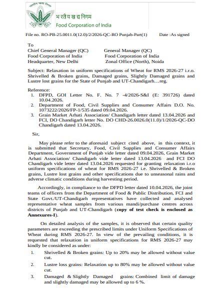 ਜਾਣਕਾਰੀ ਅਨੁਸਾਰ, ਐਫ.ਸੀ.ਆਈ. ਇਸ ਵੇਲੇ ਸਿਰਫ 6% ਤੱਕ ਟੁੱਟੇ ਜਾਂ ਸੁੰਗੜੇ ਦਾਣਿਆਂ ਵਾਲੀ ਕਣਕ ਹੀ ਸਵੀਕਾਰ ਕਰਦਾ ਹੈ, ਪਰ ਪੰਜਾਬ ਦੀ ਫਸਲ ਵਿੱਚ ਇਹ ਮਾਤਰਾ ਲਗਭਗ 20% ਤੱਕ ਪਹੁੰਚ ਗਈ ਹੈ। ਇਸ ਲਈ, ਐਫ.ਸੀ.ਆਈ. ਪੰਜਾਬ ਨੇ ਸੁਝਾਅ ਦਿੱਤਾ ਹੈ ਕਿ 20% ਤੱਕ ਖਰਾਬ ਹੋਏ ਦਾਣਿਆਂ ਵਾਲੀ ਕਣਕ ਨੂੰ ਵੀ ਕੀਮਤ ਘਟਾਏ ਬਿਨਾਂ ਖਰੀਦਿਆ ਜਾਣਾ ਚਾਹੀਦਾ ਹੈ।