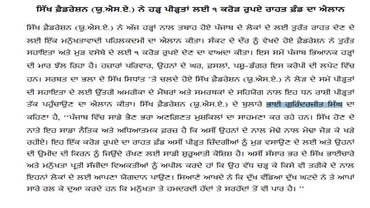 Punjab Floods Live Updates : ਪੀੜਤਾਂ ਦੀ ਮਦਦ ਲਈ ਅੱਗੇ ਆਈ ਸਿੱਖ ਫੈਡਰੇਸ਼ਨ (USA) ਵੱਲੋਂ ਤੁਰੰਤ ਸਹਾਇਤਾ ਵੱਜੋਂ 1 ਕਰੋੜ ਰੁਪਏ ਰਾਹਤ ਫੰਡ ਦਾ ਕੀਤਾ ਐਲਾਨ