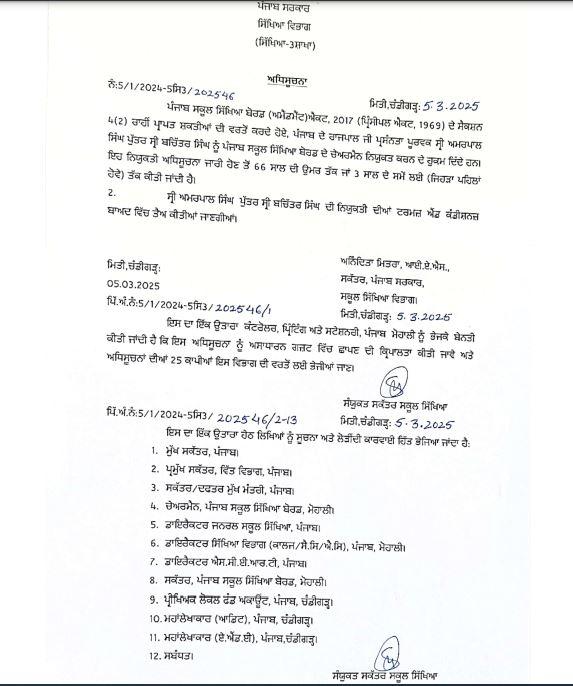ਪੰਜਾਬ ਸਰਕਾਰ ਨੇ ਇਹ ਨਿਯੁਕਤੀ ਪੰਜਾਬ ਸਕੂਲ ਸਿੱਖਿਆ ਬੋਰਡ (ਸੋਧ) ਐਕਟ, 2017 ਦੀ ਧਾਰਾ 4(2) ਤਹਿਤ ਦਿੱਤੀ ਗਈ ਹੈ।
