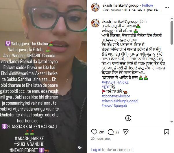 ਗੈਂਗਸਟਰ ਵੱਲੋਂ ਇੱਕ ਪੋਸਟ ਵਿੱਚ ਕਿਹਾ ਗਿਆ ਹੈ ਕਿ ਕਿ ਉਹ (ਨੈਨਸੀ) ਧਰਮਾਂ ਦੇ ਵਿਰੁੱਧ ਬੋਲਦੀ ਸੀ, ਇਸ ਲਈ ਉਸਨੂੰ ਮਾਰਿਆ ਗਿਆ ਹੈ। ਆਕਾਸ਼ ਹਰੀਕੇ ਅਤੇ ਸੁੱਖਾ ਸੰਧੂ ਨੇ ਸੋਸ਼ਲ ਮੀਡੀਆ ਪੋਸਟ ਰਾਹੀਂ ਇਸ ਕਤਲ ਦੀ ਜ਼ਿੰਮੇਵਾਰੀ ਲੈਂਦਿਆਂ ਲਿਖਿਆ, ''ਵਾਹਿਗੁਰੂ ਜੀ ਕਾ ਖਾਲਸਾ, ਵਾਹਿਗੁਰੂ ਜੀ ਕੀ ਫਤਿਹ। ਵਿੰਡਸਰ, ਓਨਟਾਰੀਓ (ਕੈਨੇਡਾ) ਵਿੱਚ ਨੈਨਸੀ ਗਰੇਵਾਲ ਦਾ ਕਤਲ ਸਾਡੇ ਭਰਾਵਾਂ ਨੇ ਕੀਤਾ ਸੀ। ਮੈਂ, ਆਕਾਸ਼ ਹਰੀਕੇ ਅਤੇ ਸੁੱਖਾ ਸੰਧੂ ਇਸ ਦੀ ਜ਼ਿੰਮੇਵਾਰੀ ਲੈਂਦੇ ਹਾਂ। ਇਸ ਔਰਤ ਨੇ ਧਰਮ ਅਤੇ ਖਾਲਿਸਤਾਨ ਬਾਰੇ ਬੁਰਾ-ਭਲਾ ਕਿਹਾ ਸੀ, ਅਤੇ ਉਸਨੂੰ ਇਸਦੇ ਨਤੀਜੇ ਭੁਗਤਣੇ ਪਏ ਹਨ। ਸਾਡੀ ਕਿਸੇ ਵੀ ਧਰਮ ਨਾਲ ਕੋਈ ਦੁਸ਼ਮਣੀ ਨਹੀਂ ਹੈ। ਪਰ ਜੋ ਕੋਈ ਵੀ ਉਸ ਵਾਂਗ ਭਾਈਚਾਰੇ ਵਿਰੁੱਧ ਬੋਲਦਾ ਹੈ, ਉਸਦਾ ਵੀ ਇਹੀ ਹਾਲ ਹੋਵੇਗਾ।''